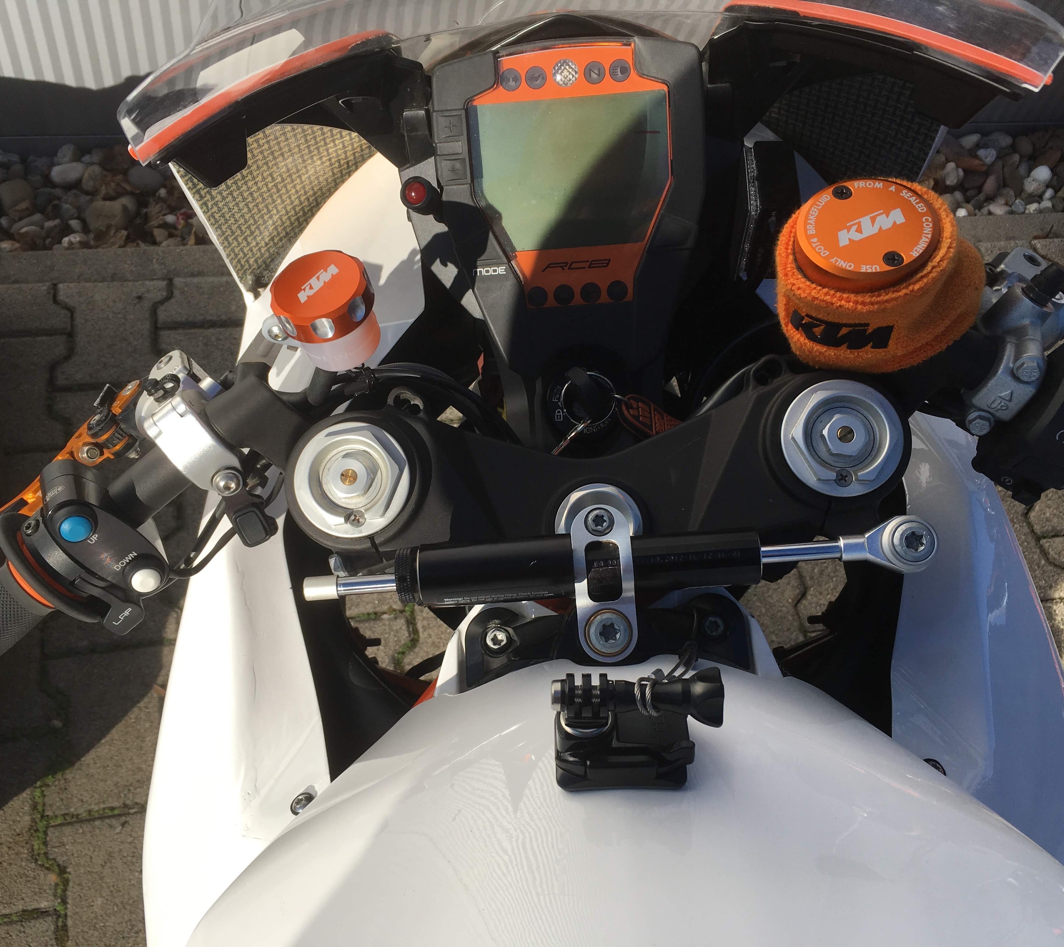 Zunächst ist einmal festzuhalten, dass der Platz bei der RC8R sehr begrenzt ist. Dazu kam auch noch, dass die Maßangaben der GO ECU und der GO IMU nicht ganz korrekt angegeben waren. In einem älteren, an sich ganz gutem Einbauvideo von Micron werden zwar ein paar Montagepunkte gezeigt, die man analog auch auf die Leone hätte anwenden können. Nur hat man beim Rennstreckenbike dank fehlender Lampe etc. etwas weniger "Angriffsfläche" um so eine Box irgendwo fest zu kleben. Dafür hat man im vorderen Bereich, da wo sonst beim Serienbike die Lichtanlage verbaut ist, etwas mehr Platz. Ich nutze bei meinem Tracker auch das Halterungs-Kit von KTM für die Fahrzeug-ECU etc. Das war letztendlich auch mein Ansatz für die Montage. Dafür habe ich mir nur noch entsprechende Halterungen bauen müssen.