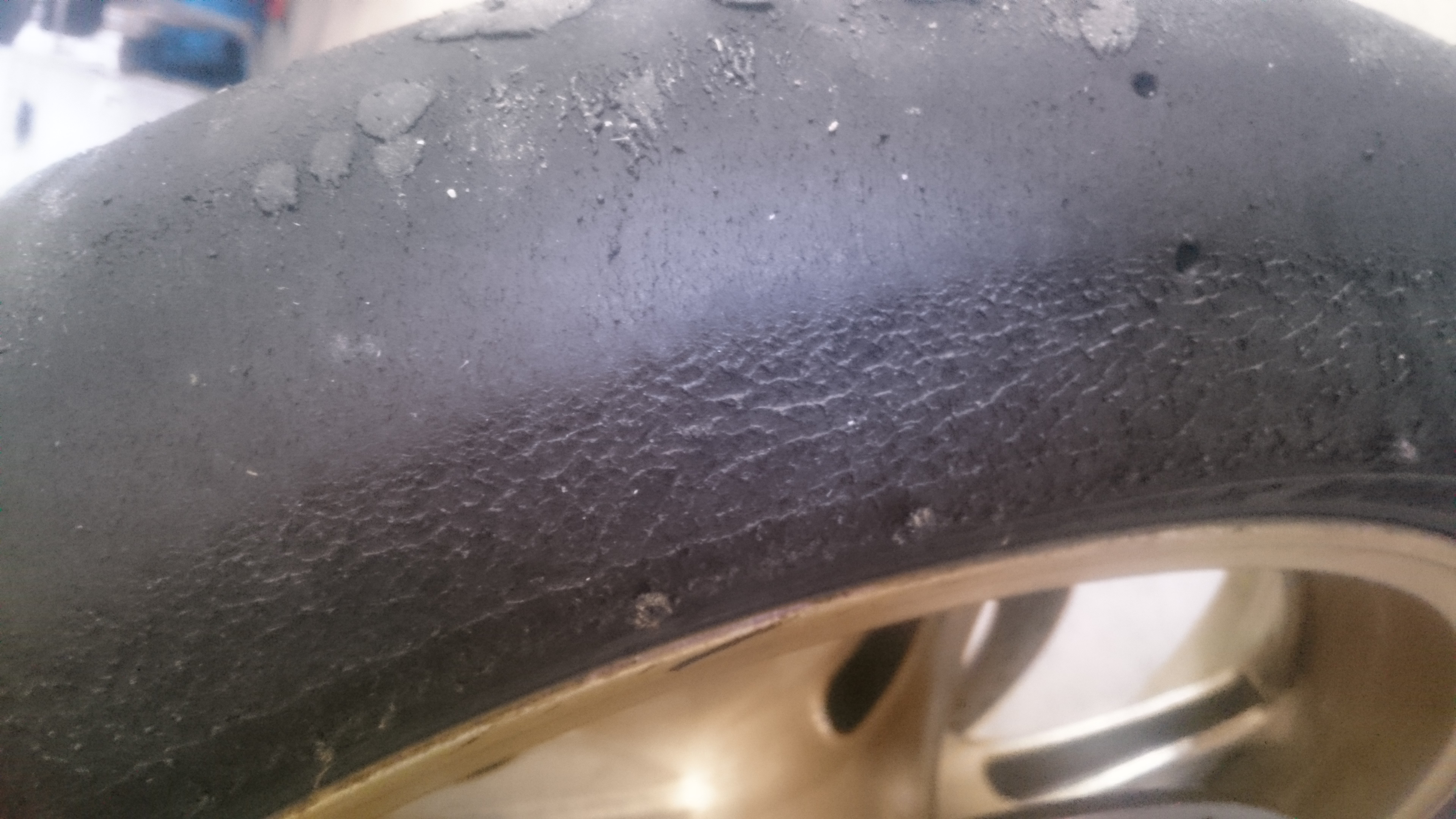 Im Bereich des Verschleißindikators liegt in der Oberfläche eine "Störstelle" vor, es fehlt etwas Material, das umliegende Gummi verformt sich etwas anders. In Deinem wie meinem Fall so stark, dass es hier zu etwas mehr Verschleiß kommt. Das ist die Auswaschung hinter dem Indikator.