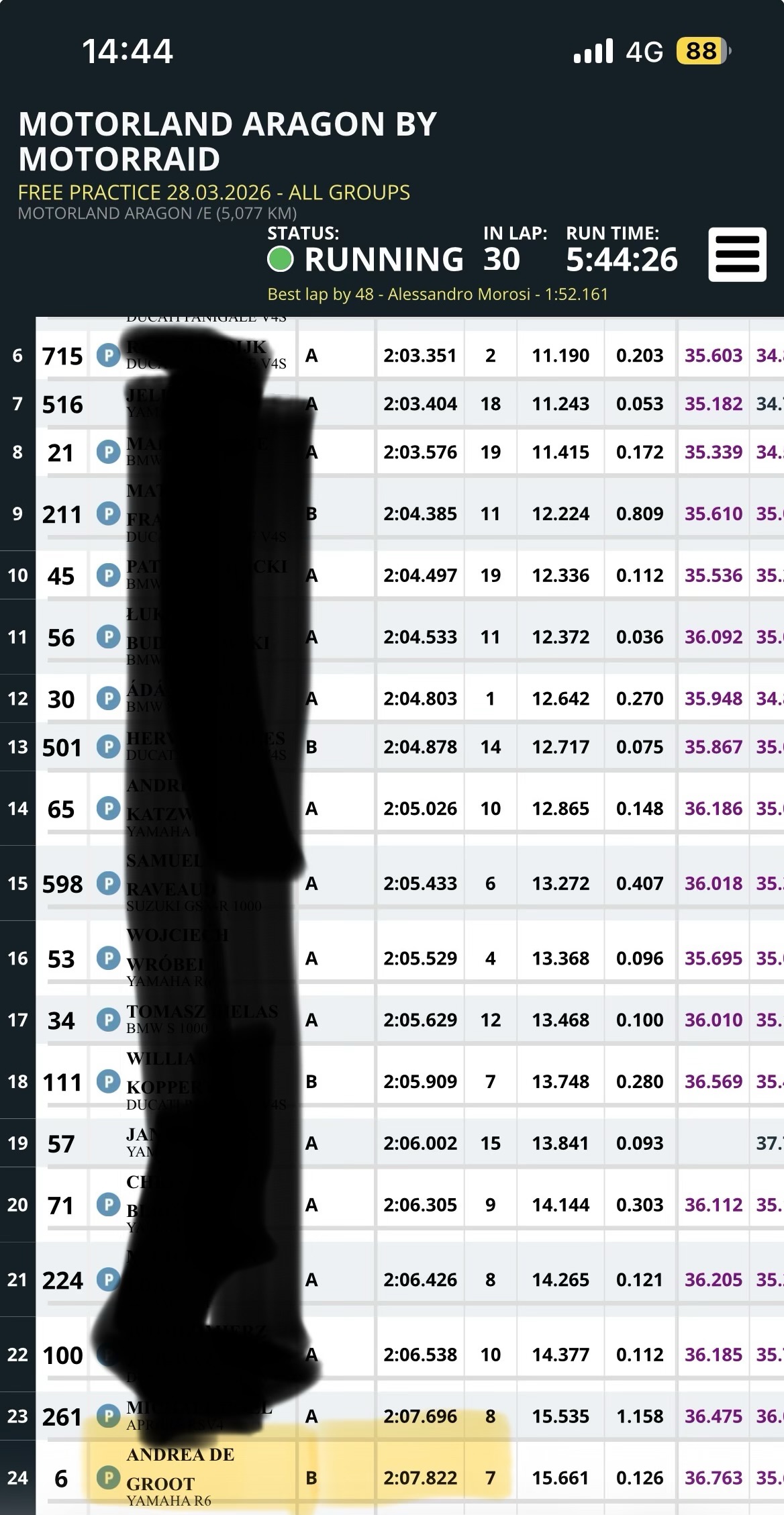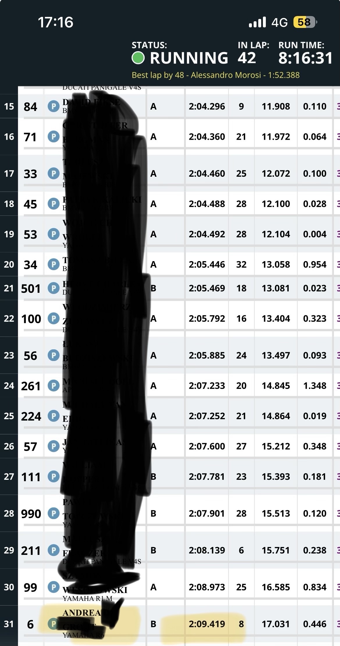 Nach der Mittagspause versuche ich, VZeit noch einmal zu vertrauen. Und ja, was ist das, die 2:09 wird kurz vor Kurve 5 eine 2:08. Und dann bleibt es eine. Und dann wird es kurz eine 2:09 (aufmerksame Beobachter wissen, wo das passiert ist) und ich drehe und drehe und freue mich auf den kleinen Schubs. Und dann direkt wieder drehen und bloß nich so viel Zeit verlieren auf die Gegengerade. Hoffentlich will Herr Morosi nicht schon wieder unterm Ellenbogen durch mit seiner kleinen R1. Und dann zählt VZeit runter und runter. Bei 200m denke ich "hoffentlich bekomme ich das gebogen" und versuche, die Fuhre in den Wind zu manövrieren. Und dann sehe ich, dass ich definitiv nicht da innen sein werde, wo immer alle innen sein müssen, damit der Ausgang passt. Ich fahre über das Rot-Gelb-Gestreifte. Es hoppelt, aber nur kurz. Und dann bin ich schon auf dem Grünen. Ich werde wohl eine Longlap einlegen müssen, zuckt es mir durch den Schädel. Egal, hier passt alles. Ich drehe, und ordentlich und schlüpfe am Ende des Curbs wieder auf die Strecke. Und bloß nicht zu früh schalten, es ist doch Gegenwind.