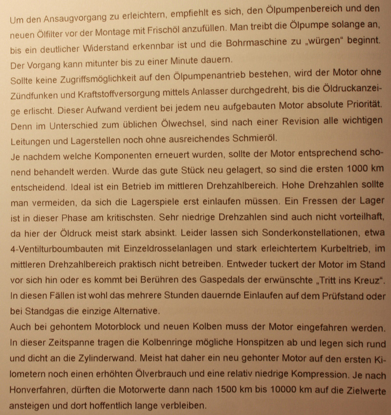 Andererseits habe ich auch schon häufiger gehört, dass Motoren schon beim Betriebstest nach dem Zusammenbau einmal unter Volllast getestet werden. Dazu kann ich allerdings nicht viel sagen, da ich in diesem Bereich nicht arbeite. SOllte es aber so sein, frage ich mich, wenn der Motor schon einmal auf dem PST voll rangenommen wurde, warum solltem an ihn dann noch so penibel einfahren?