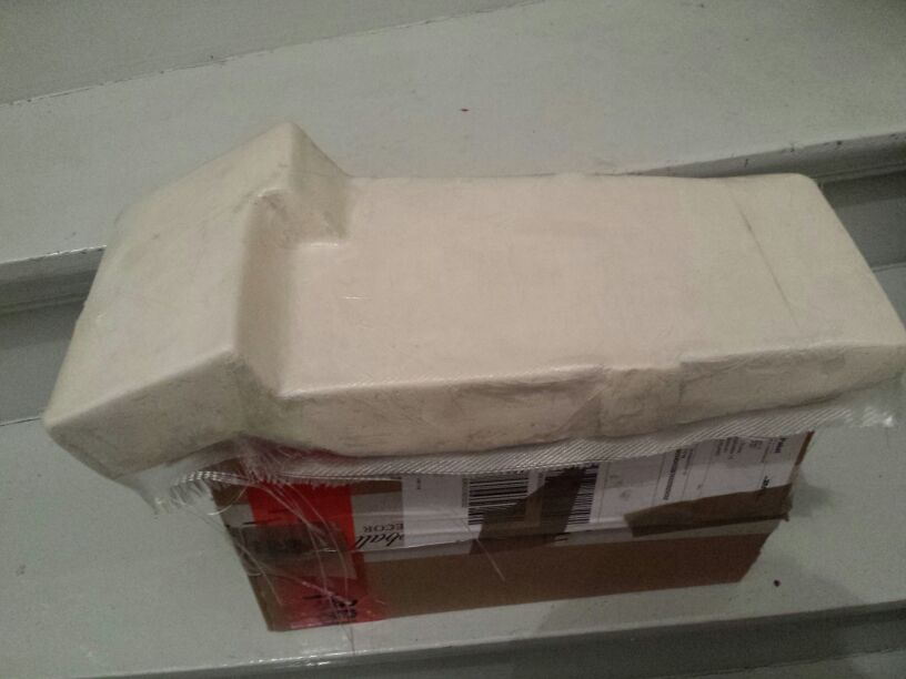Matte auf den Kasten und versucht glatt zu streichen. Die Matte hat sich ständig verschoben, Blasen geschlagen und gerade die innere Ecke hat sich immer geglättet. Die Matte außerhalb der Form hat sich immer runter gezogen. Beim nächsten mal lege ich den Gips nicht auf ein Podest, dann kann da auch nichts ziehen. Nächstes Problem war, dass die herunterhängenden Matten nicht einfach glatt runter hingen sondern sich schräg aufgestellt haben. Die Ränder standen von der Form dann etwa rundeherum mit ca. 30° ab.