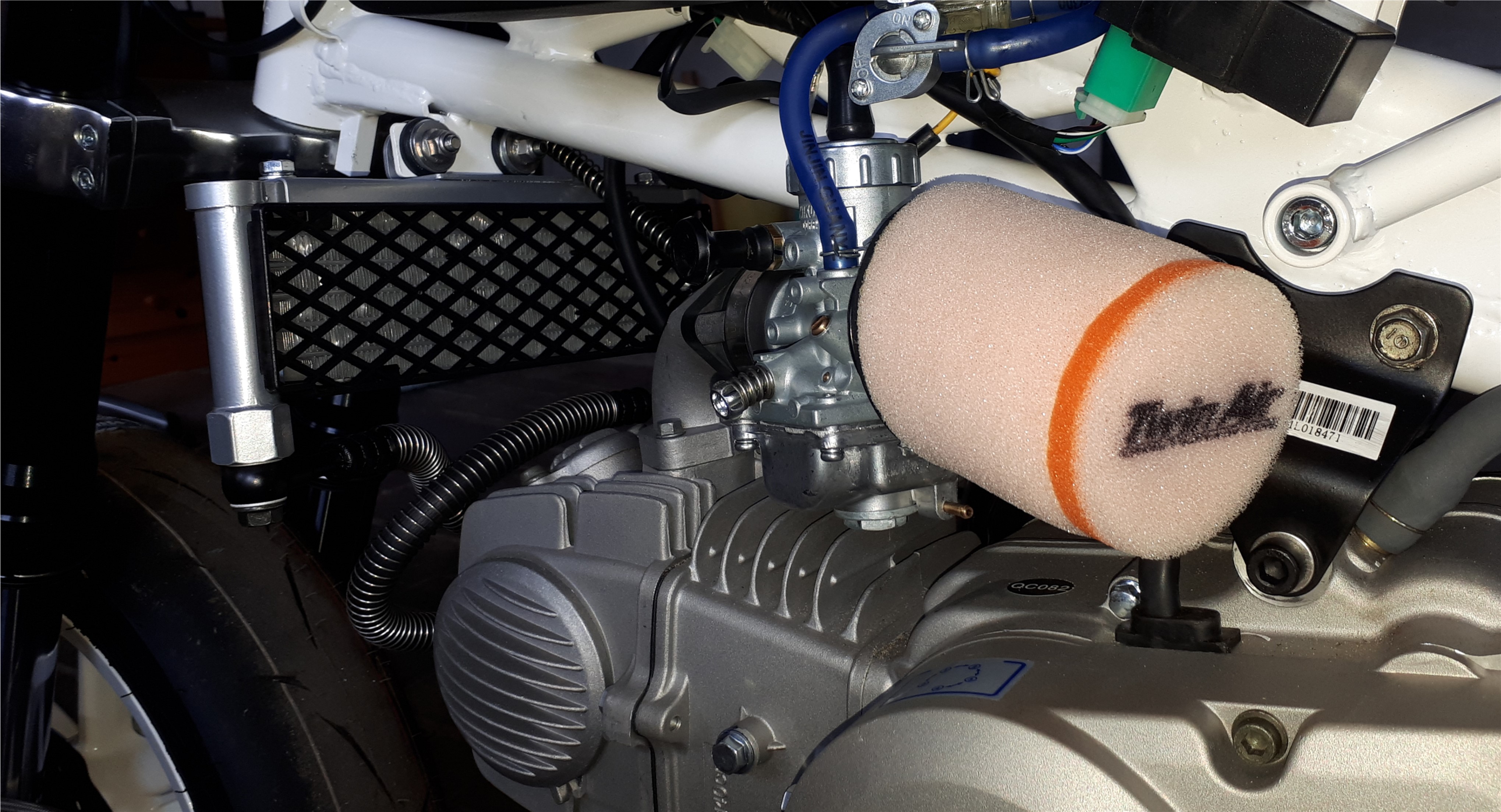 Als Luftfilter habe ich mich für einen TwinAir entschieden, damit hatte ich in meiner Rollerzeit die besten Erfahrungen gemacht, damals habe ich mehrere Filter getestet und der TwinAir hatte den höchsten Durchsatz und da sprachen wir immerhin von 325+PS Literleistung, davon ist das knuffige Pitbike natürlich weit entfernt.