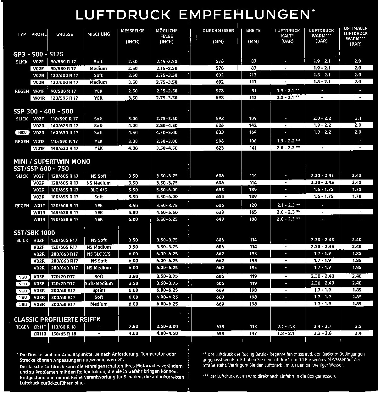 Welcher Luftdruck Bridgestone V02 (mehrere verschiedene Tabellen)