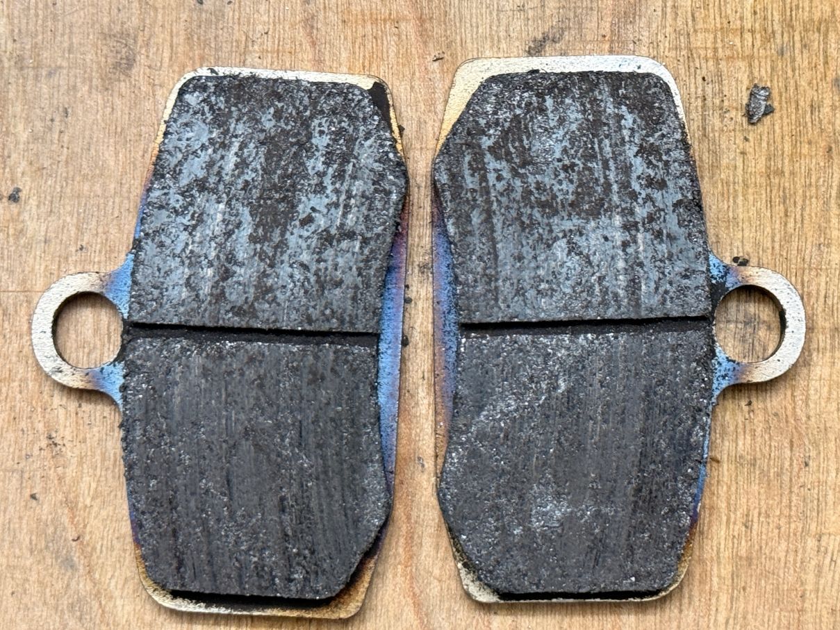 Hier mal die Beläge nach einem halben Tag auf einer Strecke mit einer langen Geraden und hartem Anbremsen (waren neu):