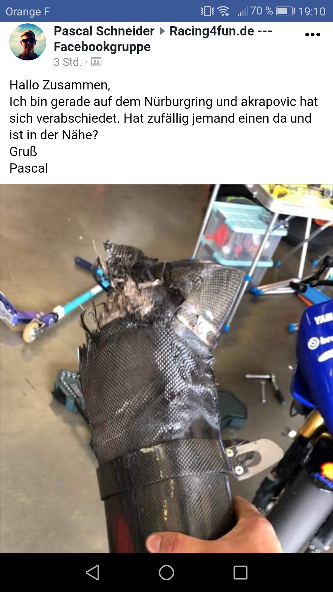 Ich weiß schon worauf du hinaus wolltest, allerdings ist nur anhand des Bildes gar nix festzustellen. Kann ja theoretisch auch ein normaler Sturzschaden sein.Whiteblade hat geschrieben:Geh mal ein paar Beiträge zurück, da ging es genau darum und das teilweise angezweifelt wurde, das ein Auspuff so „platzen“ kann.Voya hat geschrieben:Was willst du uns damit sagen?