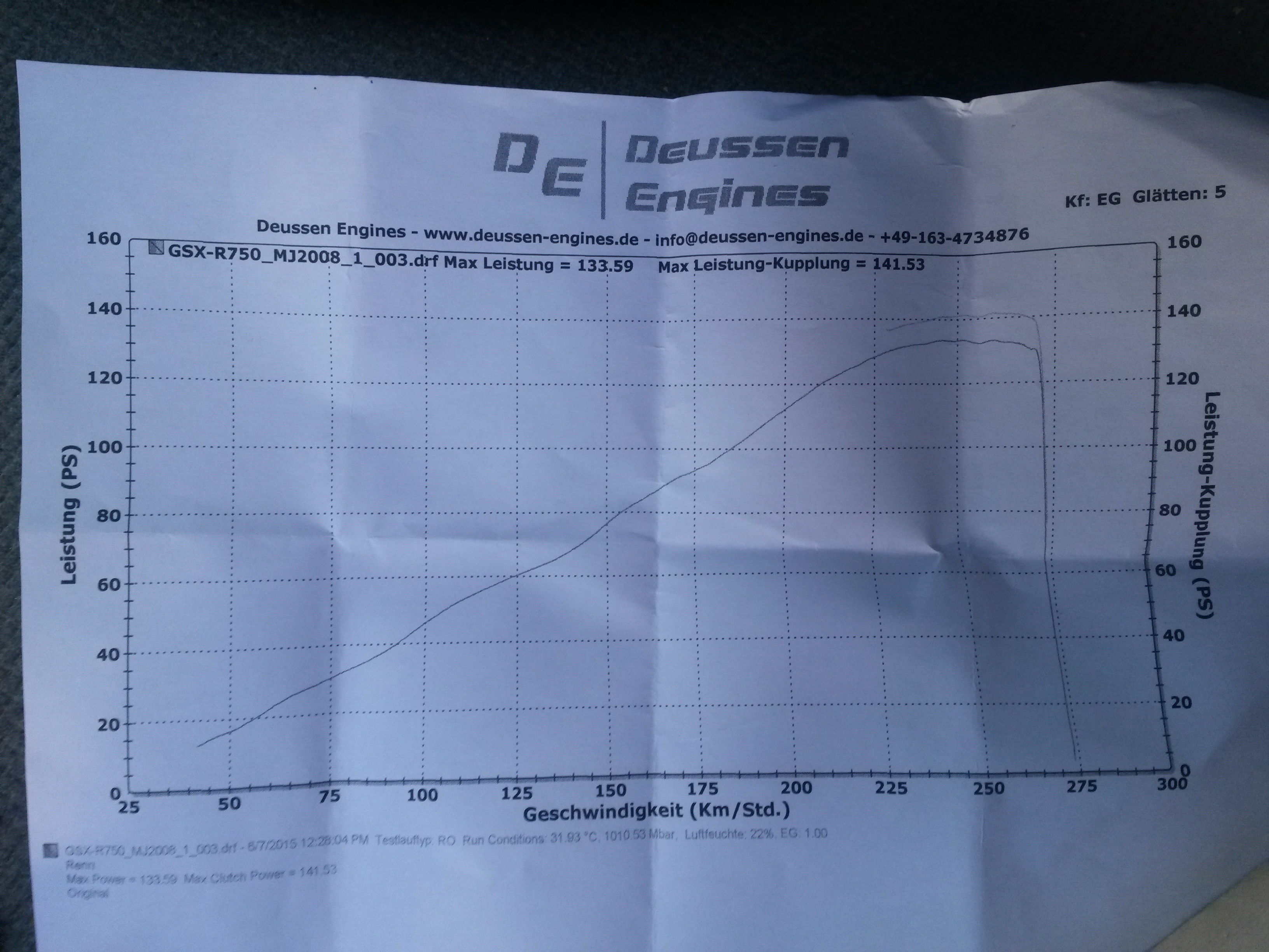 Hallo , meine Leistungsangaben bezogen sich auf den Serienmotor an der Kurbelwelle . Hinterradleistung ist natürlich deutlich weniger . Zum Vergleich : habe gestern einen alten Prüfstandsausdruck von meiner Kilo K6 gefunden .( Fuchs Rollenprüfstand ) . Leistung an der Kurbelwelle : 174,5 PS , am Getriebeausgang : 163,2 PS und am Hinterrad 147,1 PS . Also kann man sagen , Werksangabe von 178 PS im Rahmen der Meßtoleranz bzw . Serienstreung knapp erreicht . Eine am gleichen Tag auf dem selben Prüfstand gemessene Kilo K7 brachte glatte 10 PS mehr an der Kurbelwelle . Auch hier kann man sagen : Werksangabe von 185 PS erreicht . Das haben die späteren Modelle K9 bis L6 auch nicht mehr geschaft . . Wie stark die Baujahr 2000 GSX R 750 wirklich war läßt sich auch am Sporterfolg dieses Motorrades ablesen . Claus Ehrenberger wurde 2000 deutscher Superstock Meister mit Laufsiegen in allen Rennen mit eben diesem Moped ! Hubraumlimit damals 1000 ccm ; R1 , ZX9 und Fireblade SC 44 waren also auch startberechtigt . Ich will auch keineswegs behaupten , die aktuellen 750er seien zu schwach . Ich wollte nur zum Ausdruck bringen , daß sich in den letzten 15 Jahren leistungsmäßig wenig bis gar nix getan hat . Wenn Suzuki bei der Leistungangabe einfach 140 PS in die Papiere schreiben würde , wäre für mich alles ok .
