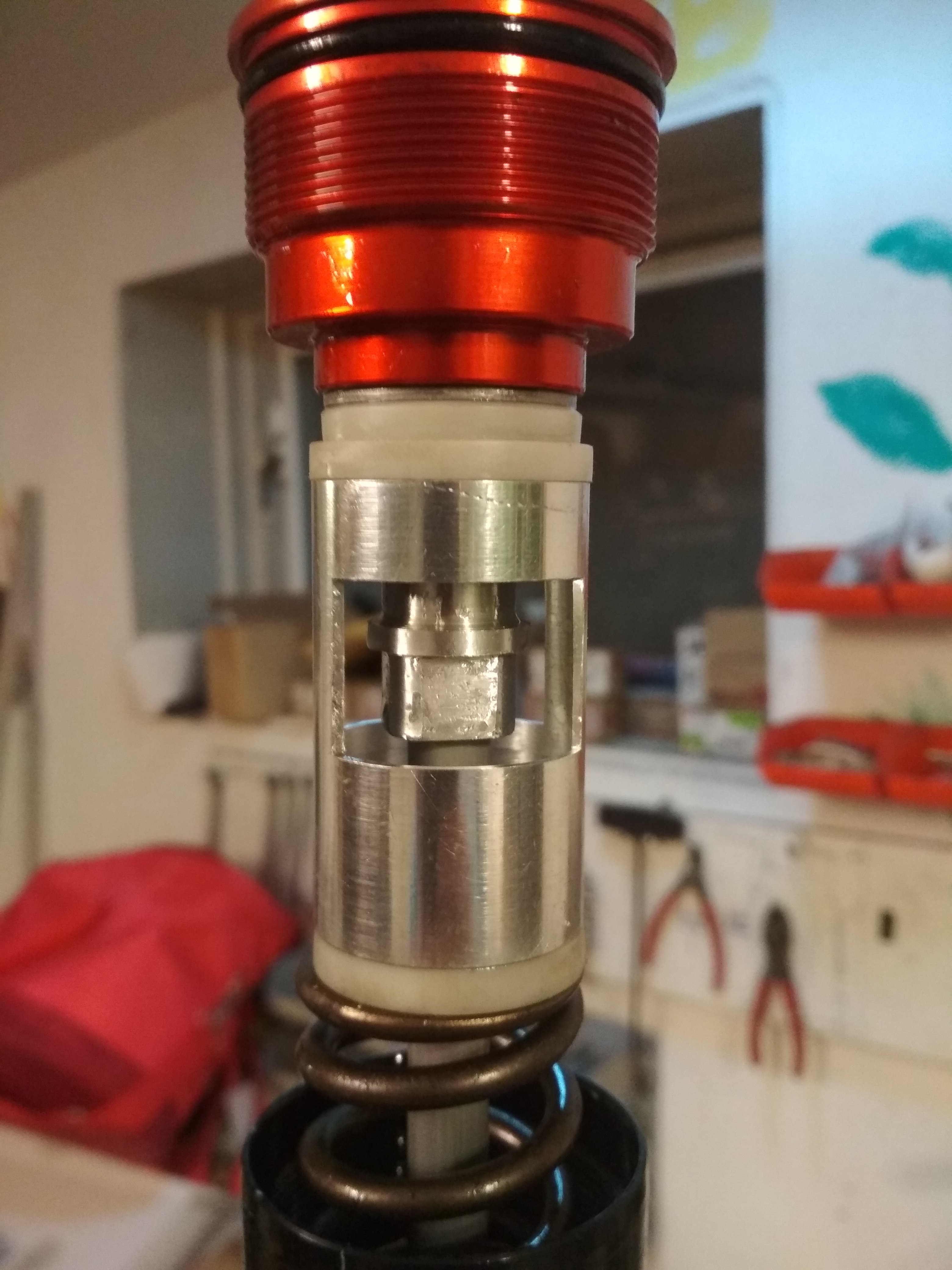 Schritt 2: SC57 Catridge Zerlegen, Shims messen WIe man sehen kann is die Fläche durch die das Öl kann beim Original Druckstufenkopf schonmal sehr viel Größer als beim SC57 Druckstufen Kopf. Die Shims sind auch unterschiedlich in jeglich erdentlichen Art und weise.