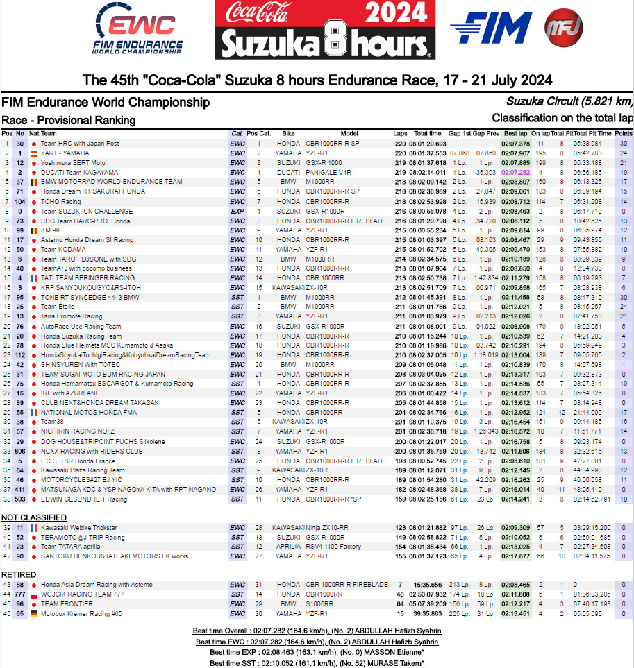 Ziemlich mau hier, die letzten 30 min. wurden nochmal extra spannend durch die Zeitstrafe für das führende Honda Team. YART zum ersten mal in Suzuka auf dem Podium (7,8 Sek. Rückstand nach 8h