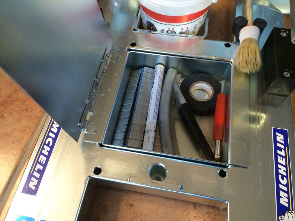 Es hat eine herausnehmbare Kiste in der man Wuchtgewichte, Edding, Ventilausdreher, Ersatzventile, Klebeband, Messer, Wuchtgewichteschaber etc verstauen kann. Der Montagearm wird mit einem Gewindebolzen auf dem Gerät befestigt und sichert so die Kiste gegen aufklappen. Dadurch kann das Teil auch hochkannt in die Ecke gestellt werden.