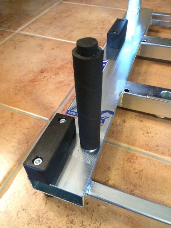 Auf der Montierwelle (die übrigens aus unkaputtbarem 42cromo4 gefertigt ist) und der Drehmomentstütze sind Gummipuffer eingeschraubt damit man beim einlegen der Felge nicht Stahl auf Stahl anstoßen kann.