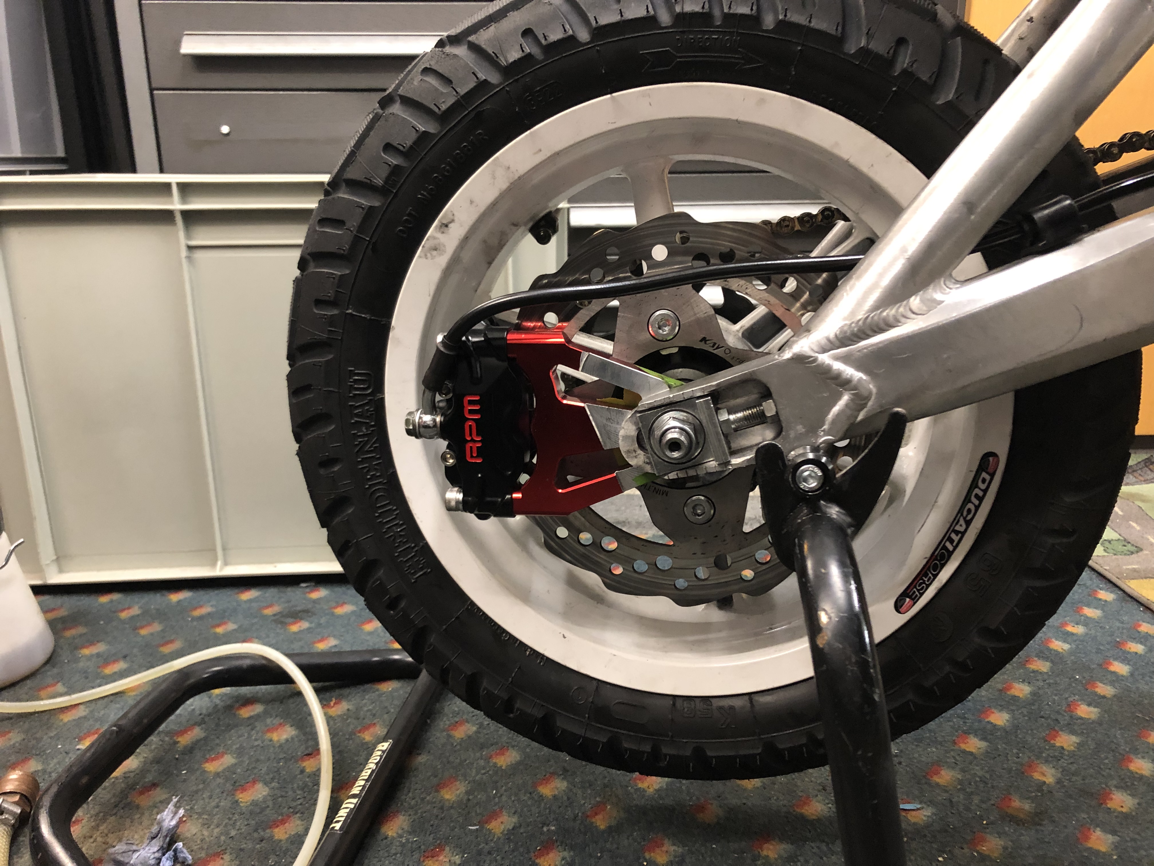 Hab zuerst die hintere Bremse abgebaut und bin nur mit der vorderen gefahren. Durchs Hörensagen hat sich es öfters bestätigt das durch hintere Bremsen der Radius enger wird. Das hat zuerst gereicht um das Projekt Hinterradbremse anzutreiben.