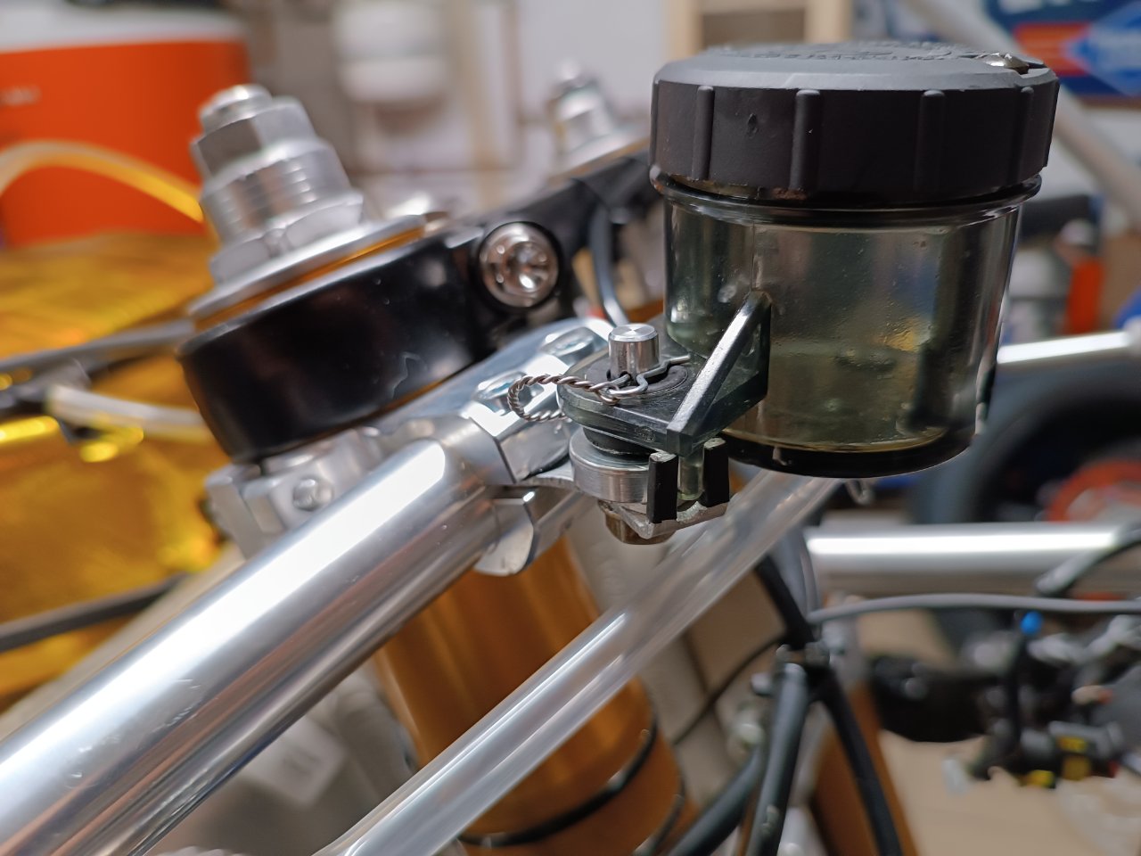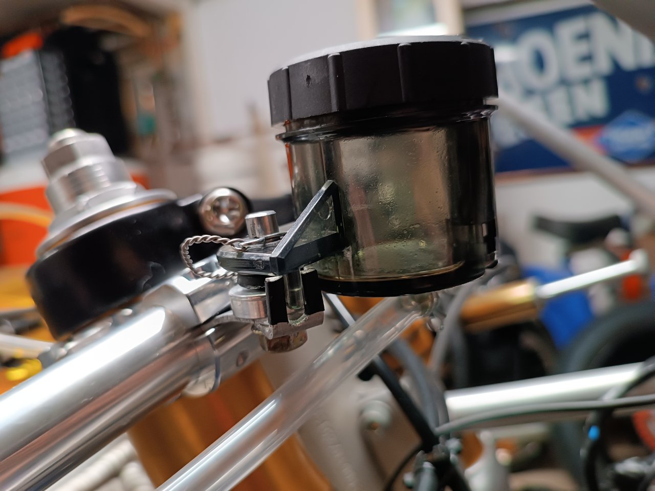 Inspiriert von der Ausführung am SERT Bike habe ich für den Bremsflüssigkeitsausgleichsbehälter einen Halter mit Schnellverschluss entworfen.