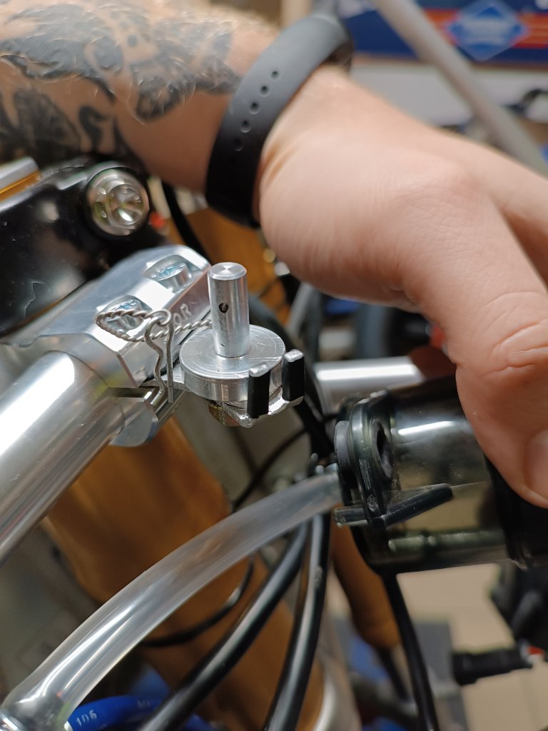 Hergestellt aus 2mm Alublech, das "locker" in der Klemmung vom Lenkerstummel sitzt und durch einen Gummi O-Ring wackelfrei an Ort und Stelle bleibt. Als Aufnahme habe ich einen meiner Tank-Schnellverschlüsse umgebaut.