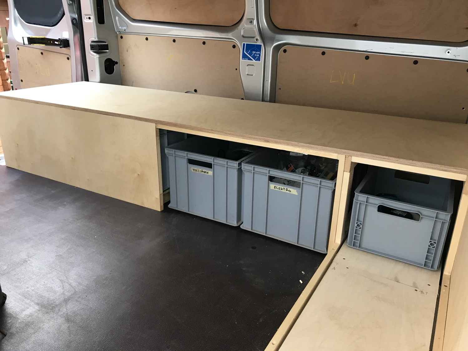 Links neben die Sitzfläche kommt noch ein Klappdeckel hin um die Lagerfläche zu verdecken. Hinterm Fahrersitz ist noch ein Regal geplant für weitere Eurokisten.