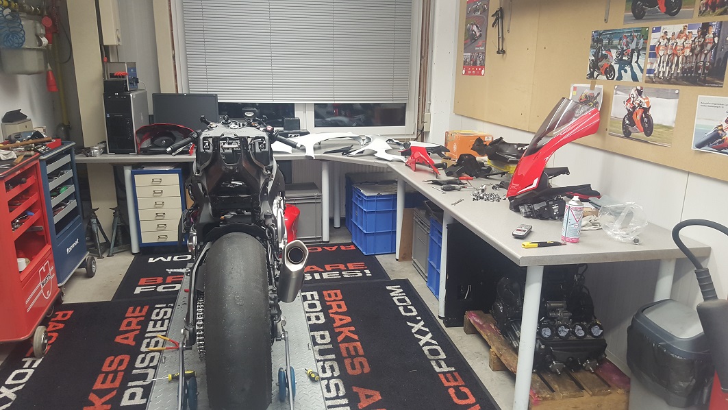 Wie eben schon erwähnt, holte ich am 7.11.15 die Yamsel bei einem Bekannten Racer ab, der diese lediglich für ein Rennen am NBR angeschafft hatte. Zuvor wurde sie auf der Strasse rund 1900km eingefahren. Ohne großartig zu verhandeln einigten wir uns auf einen Preis und der Deal war perfekt. Also ein paar rosa Scheine auf den Tisch und die 250km Heimreise angetreten. In der Werkstatt angekommen habe ich sie dann erstmal „entstaubt“ um sie dann sauber auf die Hebebühne zu verfrachten, wo sie nun wohl mindestens die nächsten 4 Monate verbringen wird.