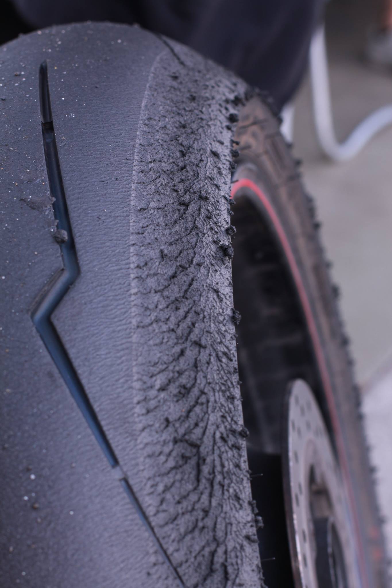 Das ist doch glaube eine zwei Komponentenmischung oder ? Wie man auf dem Foto gut erkennt, scheint der Reifen auf genau an der Grenze zur harten Mischung abzureißen, weil die härtere Mischung sich nicht so gut mit der weichen vermängt.