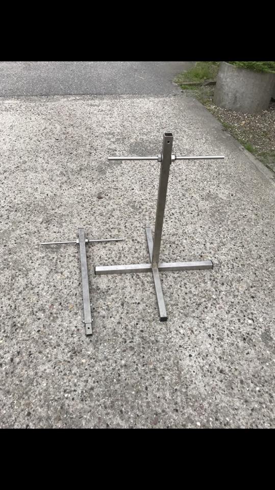 rahmen auf rollen, ein vierkantrohr senkrecht und dadurch ne achse auf die rechts und links jeweils ne felge geschoben wird un mim splint gesichert. alles edelstahl. das ding is zerlegbar und passt quasi in n rucksack.