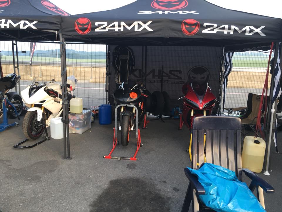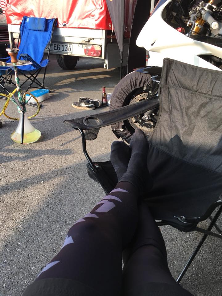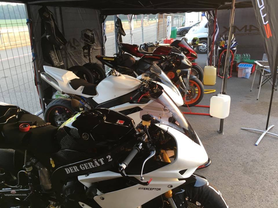 Also erstmal in Turn 1 so meine Bahnen gezogen. Auf Start/Ziel schön die Nase in den Wind gehalten, damit die Feuchtigkeit die man so mit dem Visier gesammelt hat sich verdünnisiert. Klappte eher mäßig. Naja dann wieder rein und Bestandsaufnahme. Den KR unter den Heizdecken auf jedenfall UNTER 1,4 bar. Hatte erstmal vorsichtig 1,4 unter den Decken eingestellt. Bin mit fast 1,6 reingekommen - selbst bei 1:20er Bummelzeiten. Bei dem V02 klappt das perfekt: Mit 1,6 unter den Decken gemessen, mit 1,6bar auch nachm Turn wieder rein. Anderer Reifen - andere Abläufe - Learing by doing.