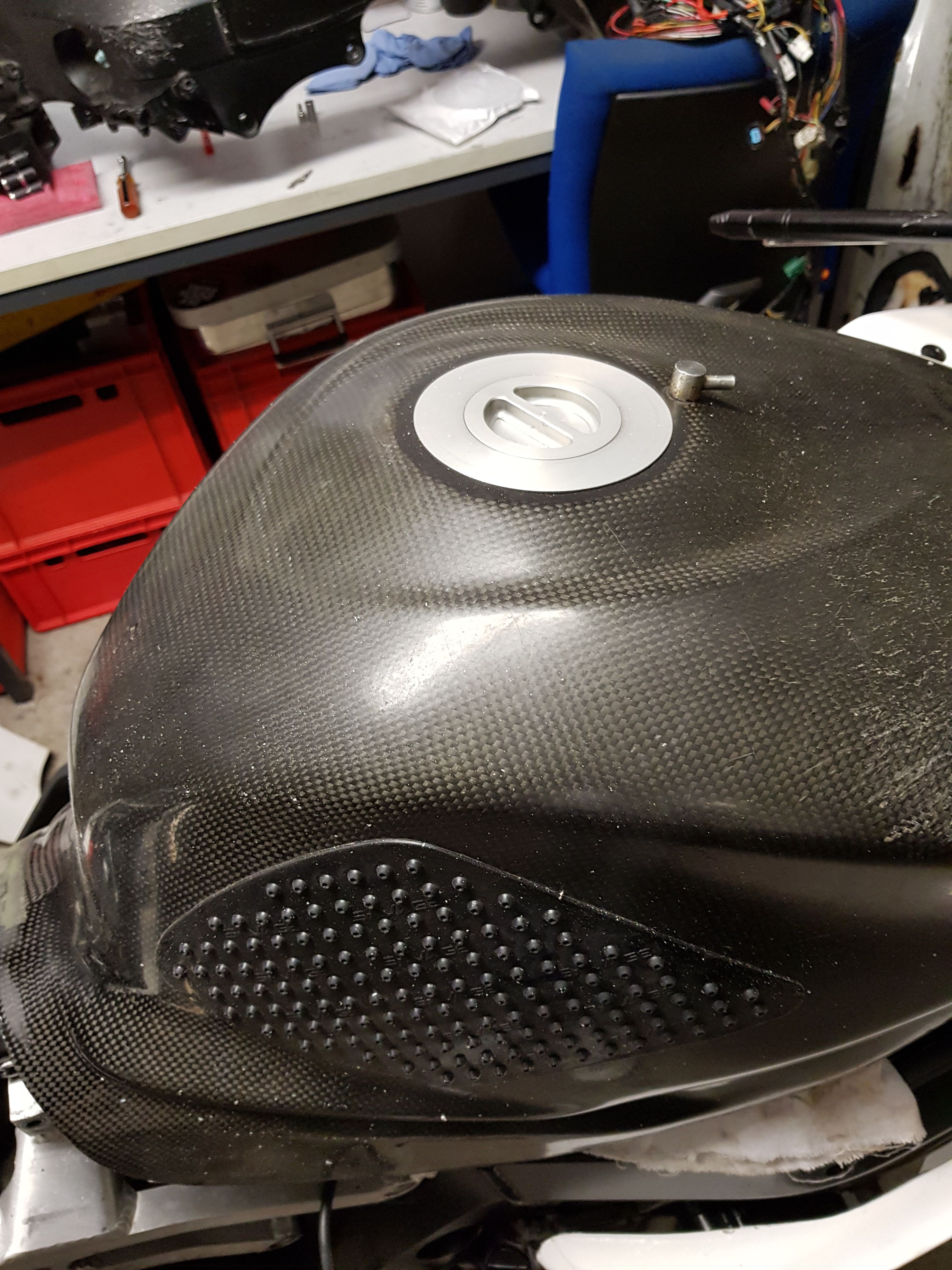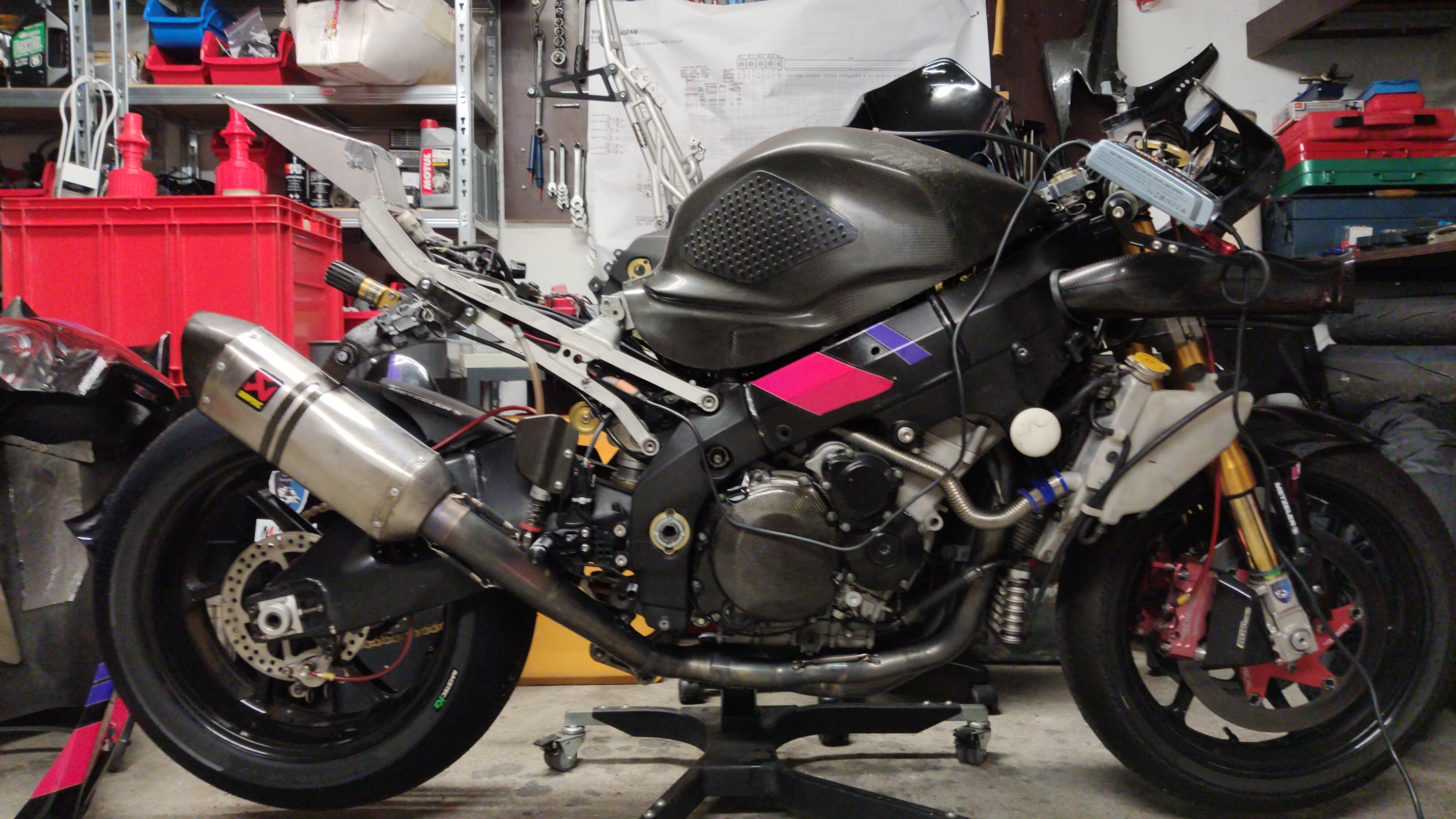 Derweil sieht's in meiner Garage nach einer Putzorgie und Großbestellung an Schrauben so aus. Langsam fängt mein Sturzrahmen aus Mettet auch wieder an, wie ein Motorrad auszusehen. Die polierte Schwinge ist natürlich gänzlich überflüssig, sieht aber geil aus
