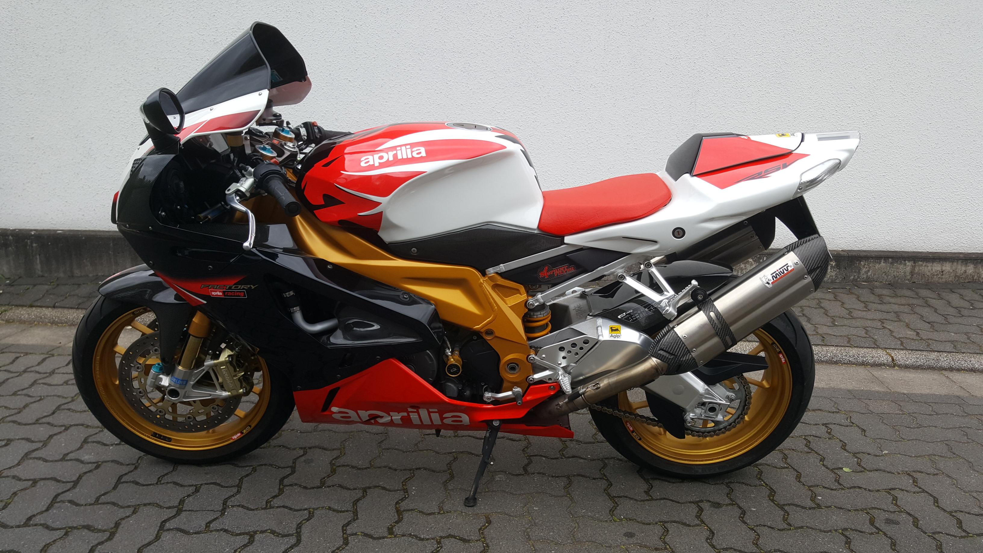 Ostern kam eine 09er Mille Factory für die Sonntagsrunde dazu.Jetzt steht schon wieder eine 04er RSV in leichten Renntrim daneben weil sofort wieder die Lust auf ein paar freie Trainings aufkam nach den ersten Meter auf der Strasse!
