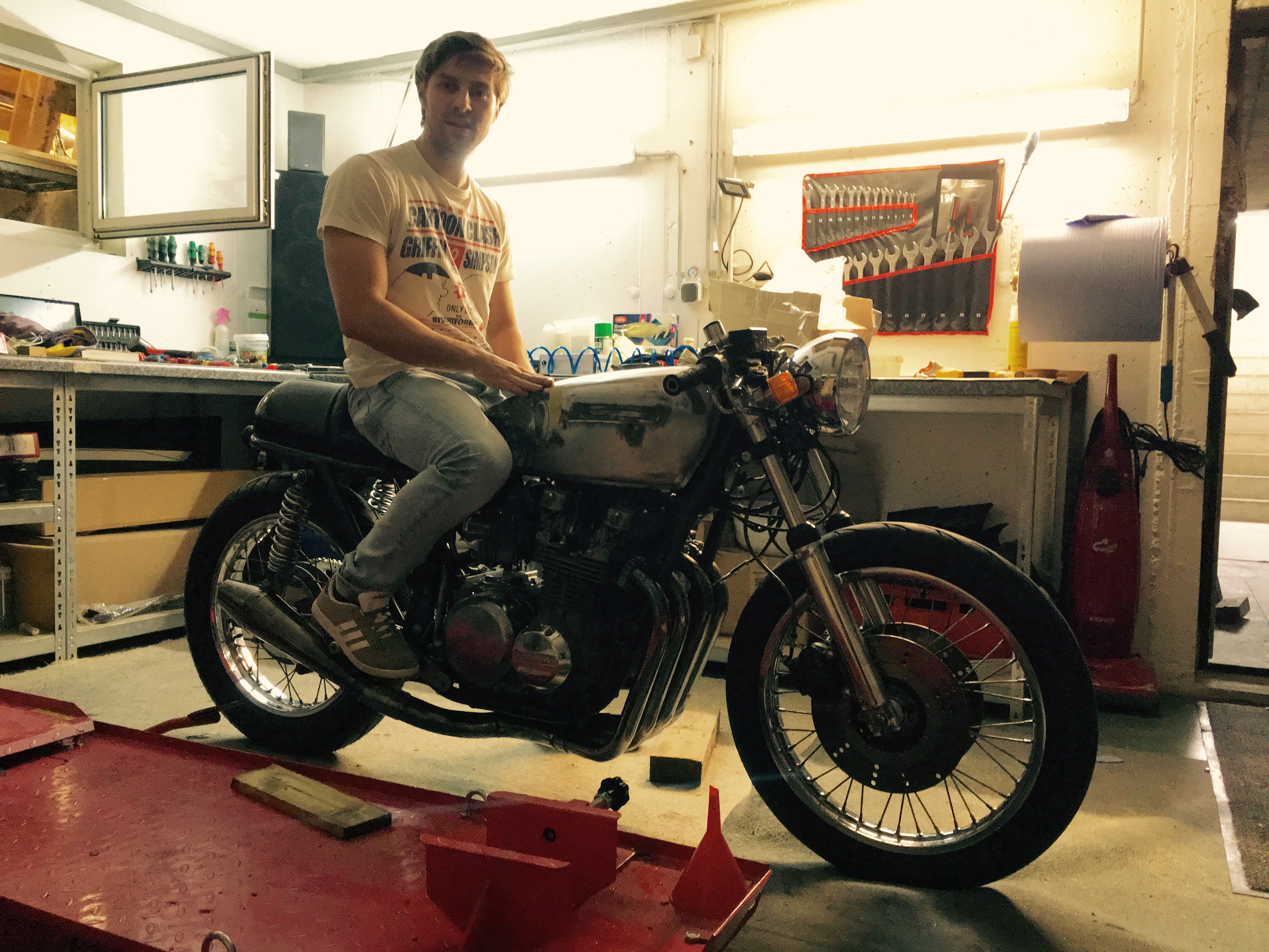 Die haben da zwei so alte Hondas und eine Suzuki billigst gekauft und dann auf Cafe Racer für die Rennstrecke getrimmt.