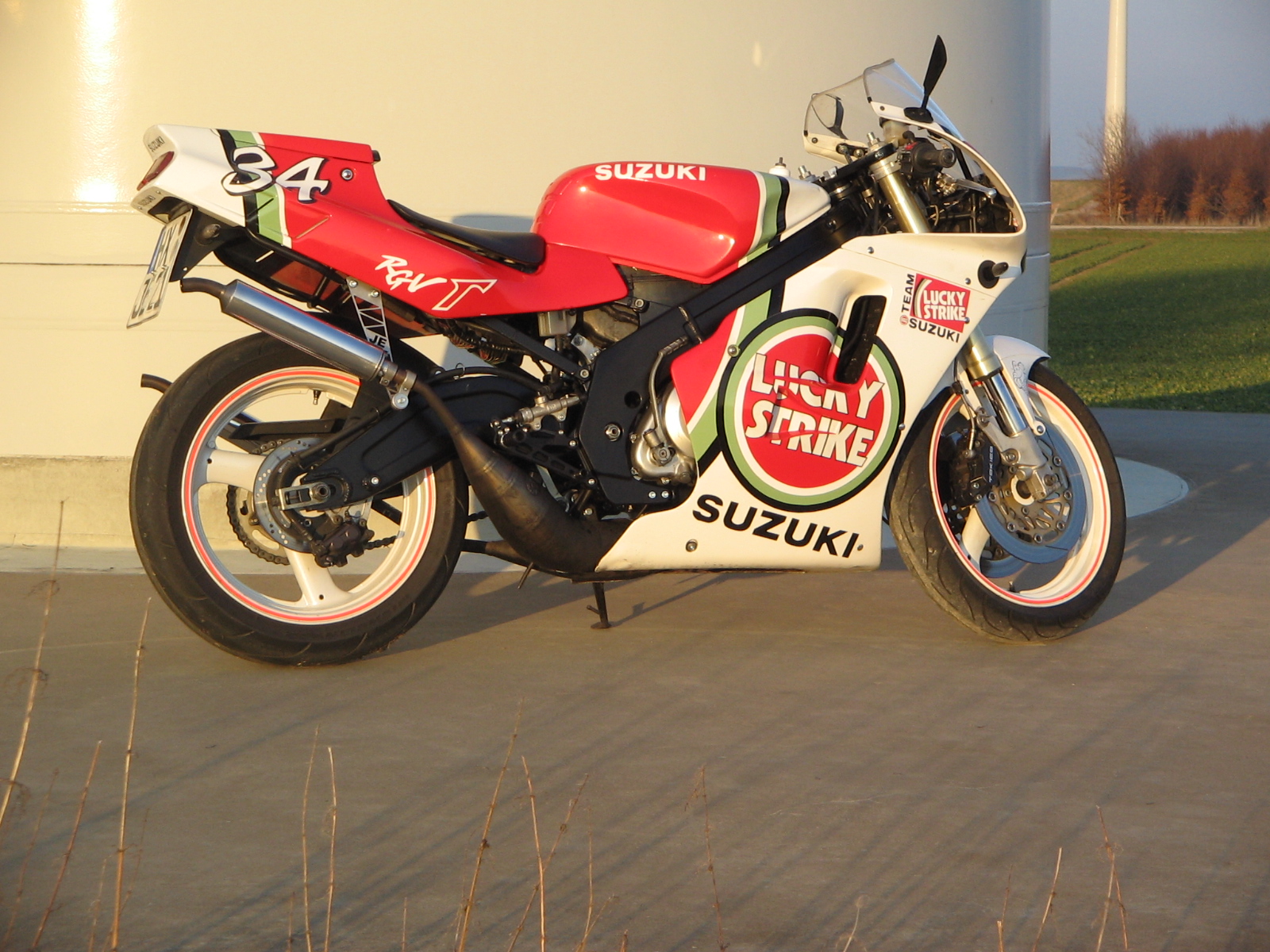 Es fing 2005 an, ich hab mir direkt nach dem Abitur für heute lächerlicherweise unter 2000€ eine sehr gut erhaltene RGV 250 Baujahr 92 mit 16000km weitestgehend original gekauft. Mein Traum war eigentlich eine RS250, als angehender Student hatte ich keine Kohle für das Ding und bin zur RGV gegangen. Ich musste das Teil eigentlich noch mit 34ps fahren, hier das älteste Foto vom Moped, den Auspuff hab ich relativ kurz nach dem Kauf dazugekauft. Bestimmt nicht viel mehr als die 34PS