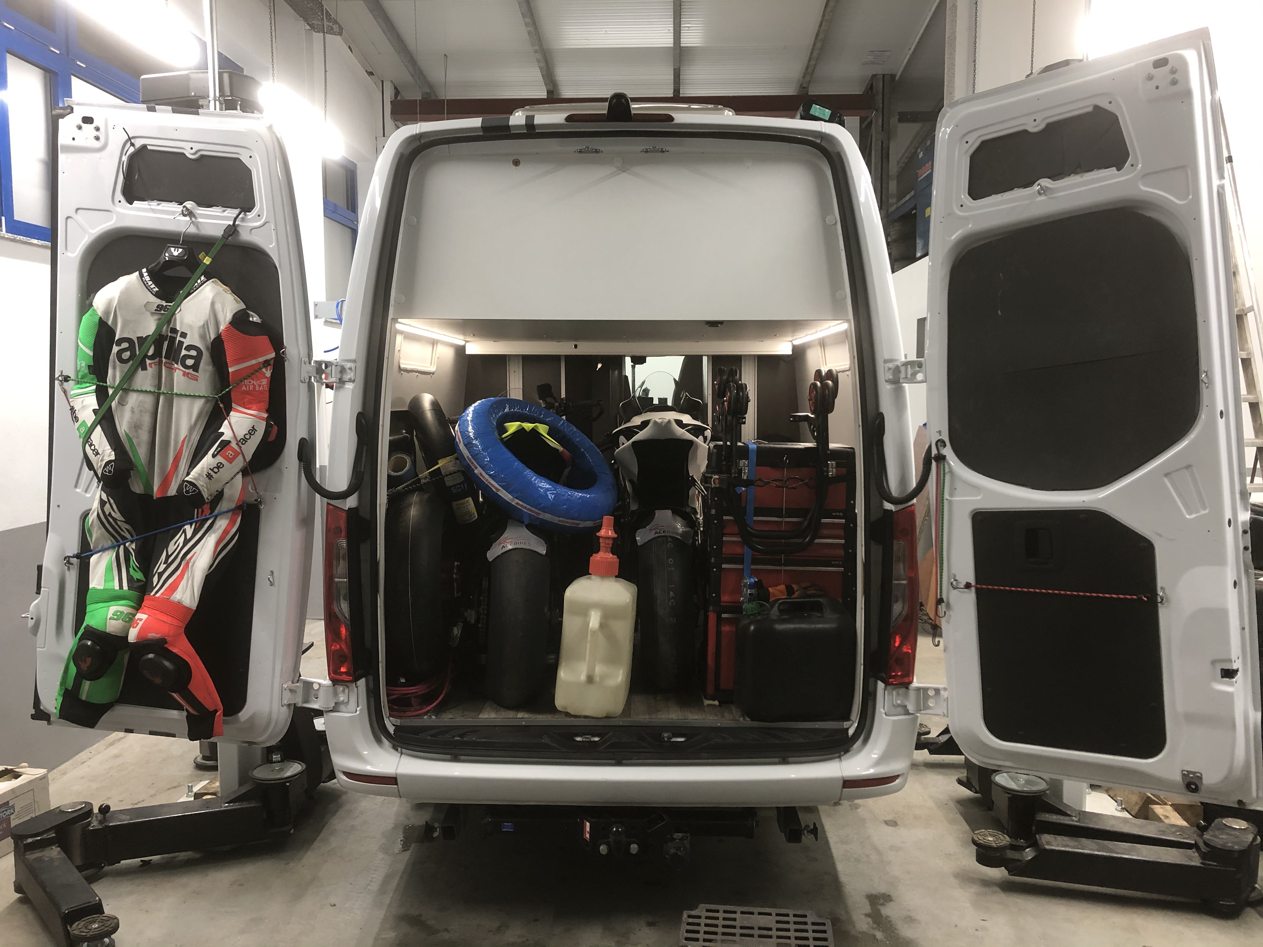 Der 2t Deseo ist mit 2 Mopeds und Equipment auch an der Beladungsgrenze, d.h. Wasser erst vor Ort befüllen nur eine Gasflasche mitnehmen, 2 wären möglich und Werkzeugkisten + Anzüge im Kombi verstauen.