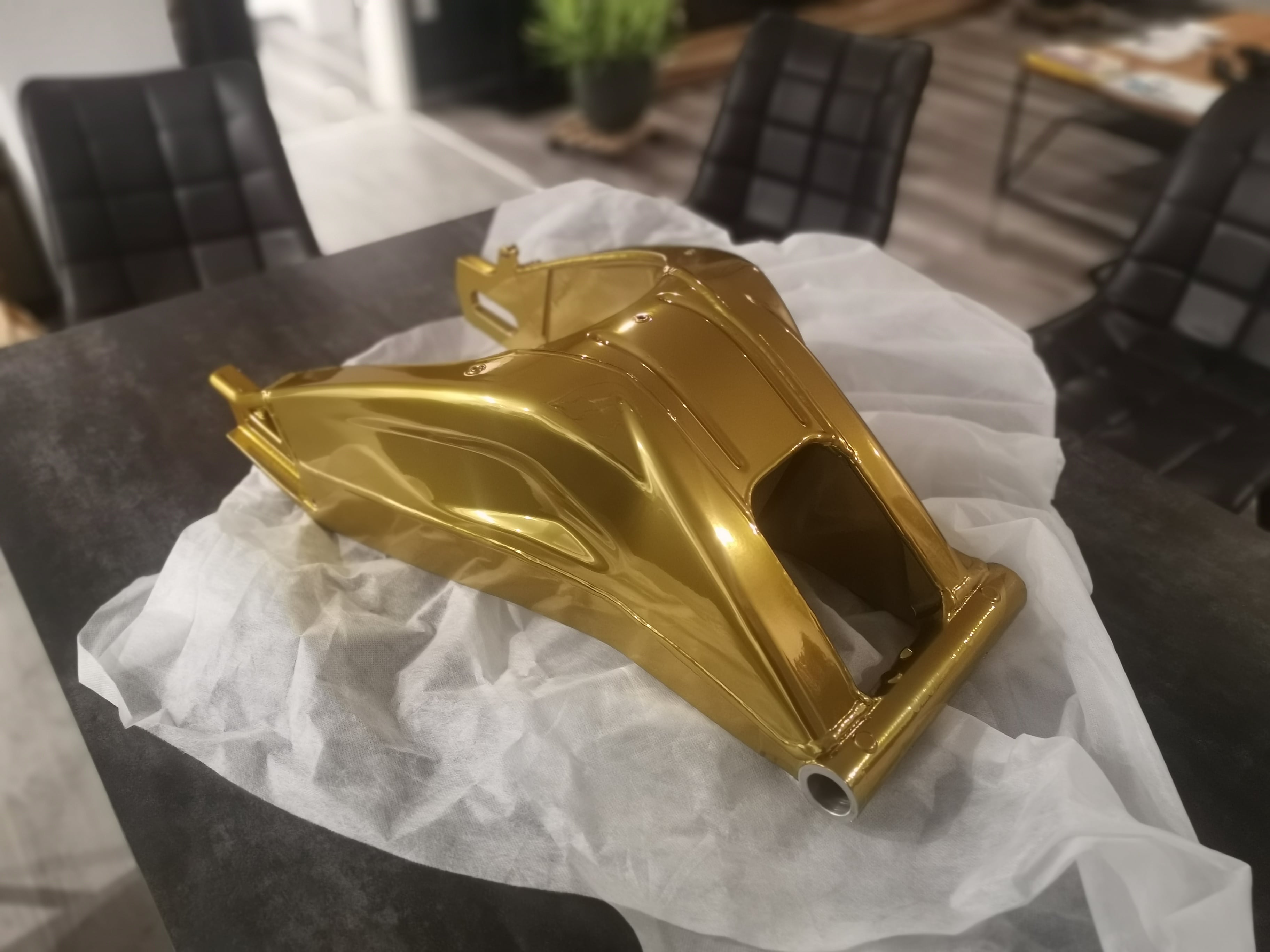 Ich habe die Schwinge in der Farbe Candy Gold beschichten lassen und habe nach dem Einbau der Lager folgendes festgestellt. Die Lagerbuchsen drücken auf die Distanzbuchse und somit ergibt sich ein Spiel von 1mm pro Seite insgesamt 2mm.