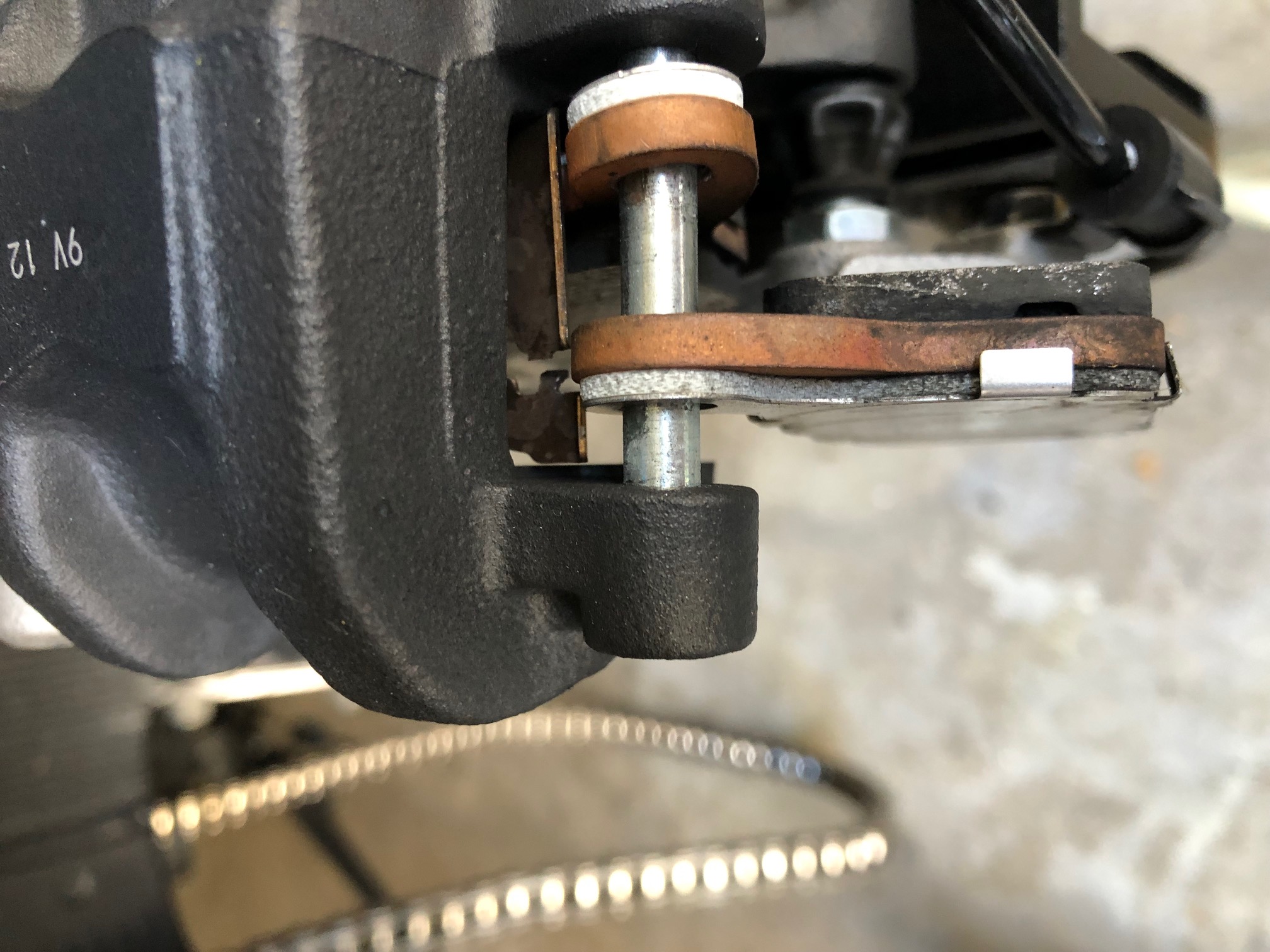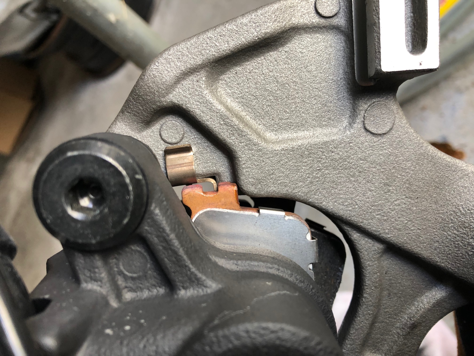 Ich habe wie an jedem Motorrad in den letzten 30 Jahren zwar ein ziemliches Gefummel am Hinterrad erwartet, weil es da eigentlich immer eng mit dem Bremssattel wird, aber dieses Mal, ist beim Berühren des hinteren Bremssattels mit dem Hinterrad der linke Bremsbelag nach unten weggeklappt, so dass er jetzt nur noch mit der hinteren Öse am Sicherungsbolzen hängt.