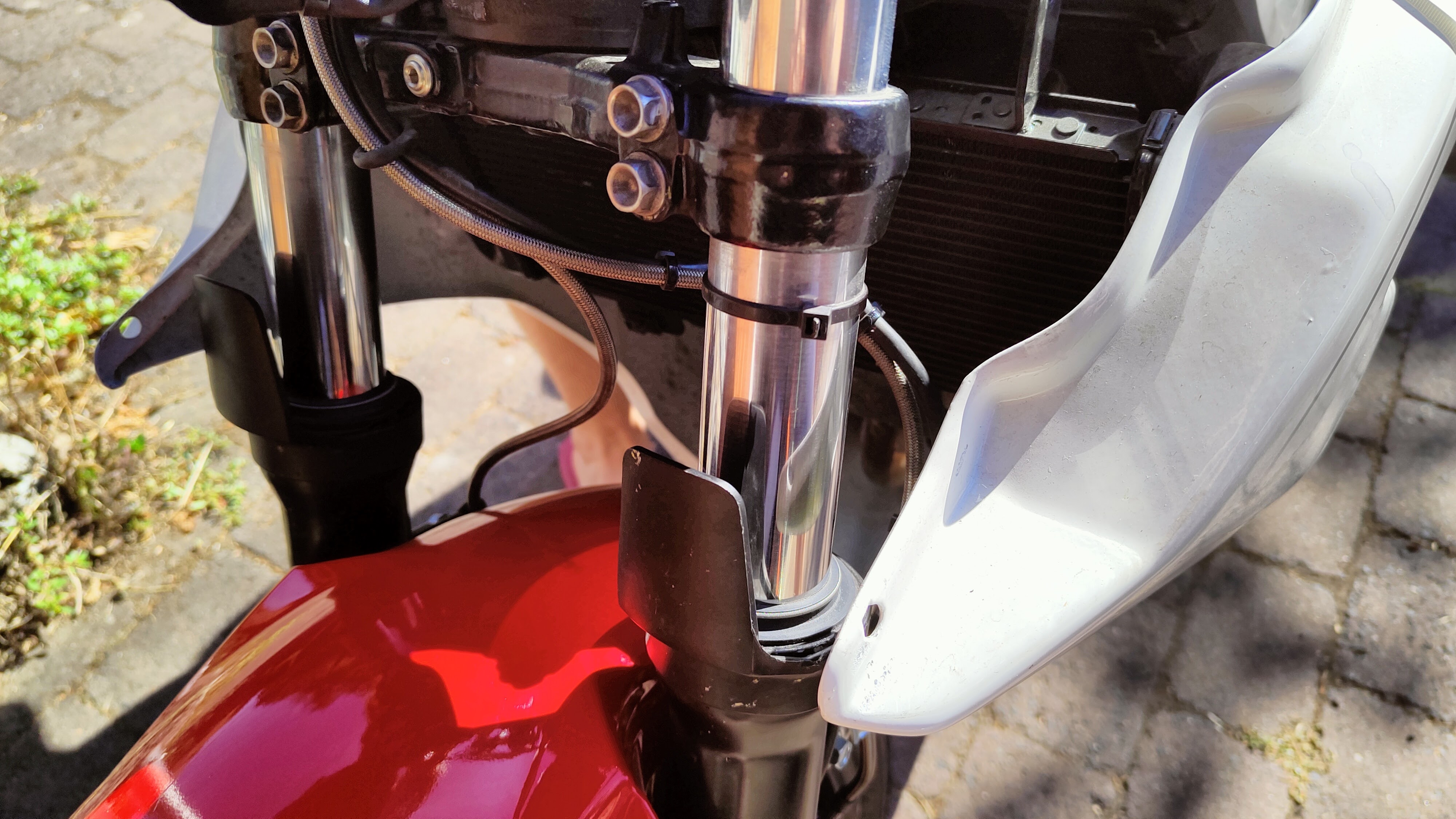 Wenn's beim Bremsen vorne dennoch durchschlägt, kanns auch am zu großen Luftpolster des Gabelöls liegen, das bei der 41er RSU Gabel zwischen 110 und 130 mm für die Rennstrecke liegen sollte.