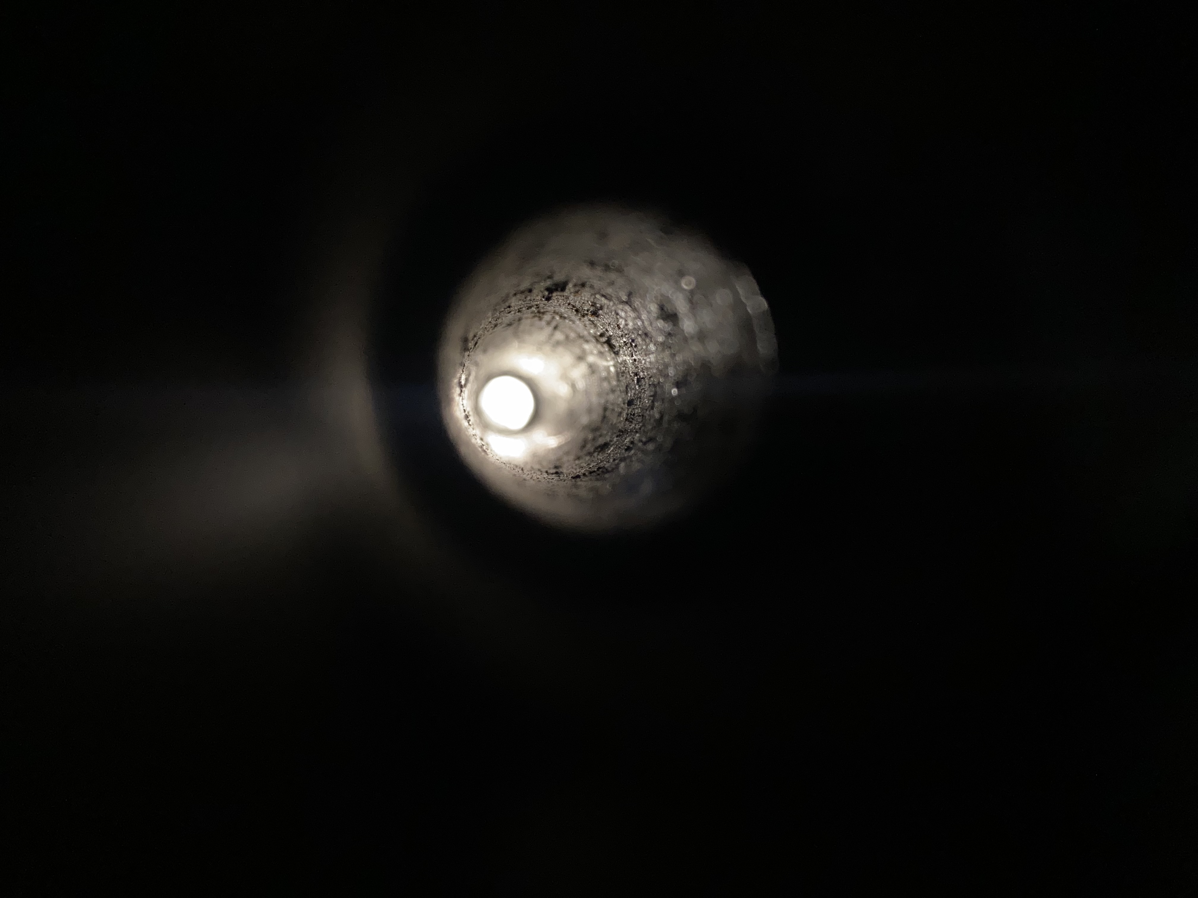 Dabei ist sofort aufgefallen, dass der Achsschützer aus Stahl außen weißes Pulver hat und rau ist, und die Achse innen (siehe Bild, da hab ich die Kamera ins Loch getan und das andere Ende ins Licht gehalten) ist rau. Farbe kann ich nicht beurteilen.