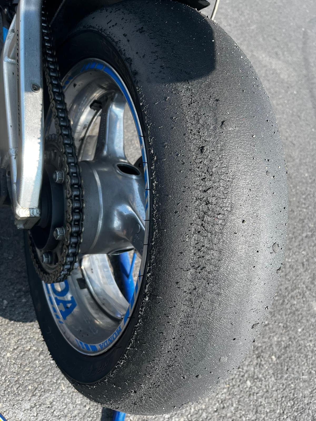 Bei mir ist Soft wie auch Medium rechts viel und links bissl weniger aufgerissen, wie ich es bisher so nicht hatte. Da ich von Fahrwerkeinstellung keine Ahnung habe, bin ich auch zum Fahrwerkprofi am Ende des zweiten Tages hin. Sonntag Vormittag sah der Reifen deutlich besser aus, aber der Gummi war an der Flanke natürlich weg. Zum Rennen habe ich einen neuen Medium montiert und der sah nach 15 Runden mit konstanten 43er Zeiten perfekt aus.