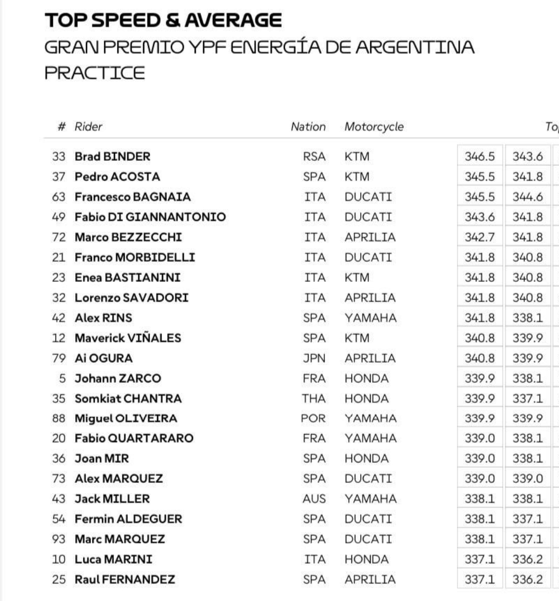 Die Lichtschranke steht wohl schon in der Bremszone, oder wie kommt der Unterschied zwischen den beiden Werksducatis zustande? Binder und Acosta als Spätbremser am schnellsten spricht auch für eine etwas zu weit hinten stehende Lichtschranke.
