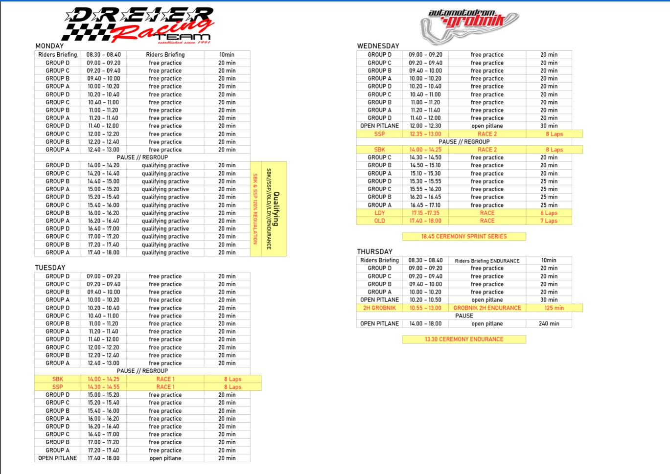 Die Trainingstage sind in 4 Gruppen unterteilt, die nach fahrerischer Stärke eingeteilt werden.