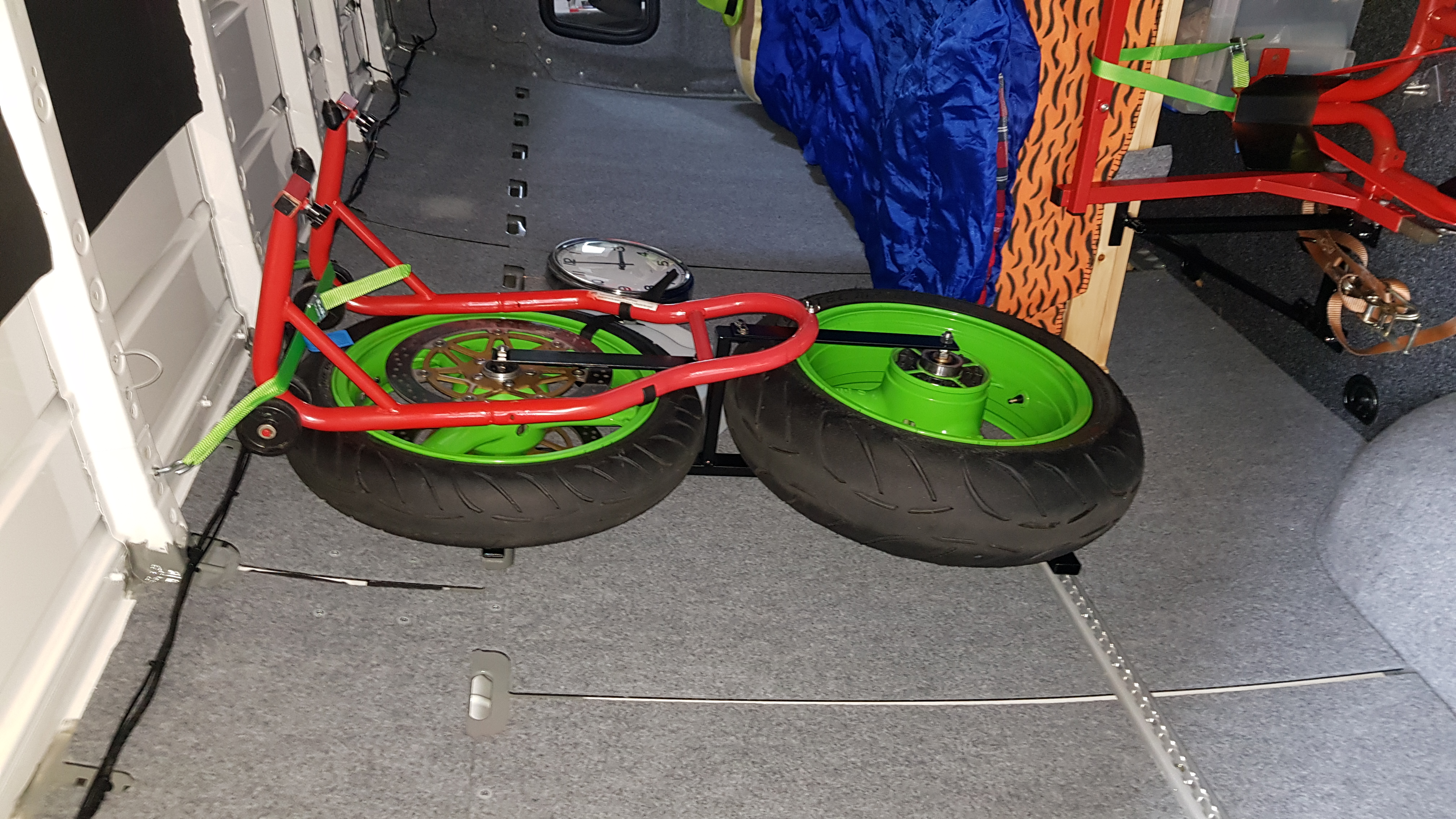 Gewicht ist natürlich immer ein Thema. Alles ist so eingebaut, dass ich ohne weitere Beladung gerademal einen Gewichtsunterschied von 10 kg rechts/links habe. 50 Kg liegen auf der Kugel des Zugfahrzeuges. Bei Beladung mit Motorrädern kann der ganz vorn unterm Boden befindliche Frischwassertank mit 110l Wasser als Balance-Ausgleich gefüllt werden und/oder zusätzliche Wasserkanister an den dort befindlichen Airline-Schienen an der Frontwand befestigt werden. Außerdem habe ich im Bedarfsfall noch passende Stahlgewichte, die ganz vorn in die Deichsel befestigt werden könnten.