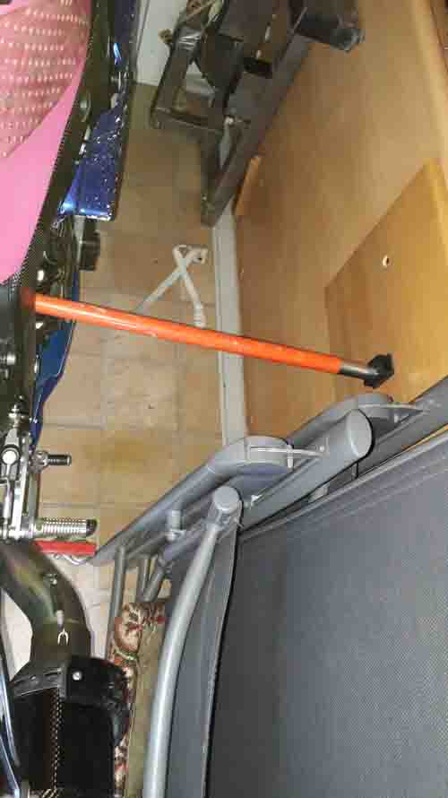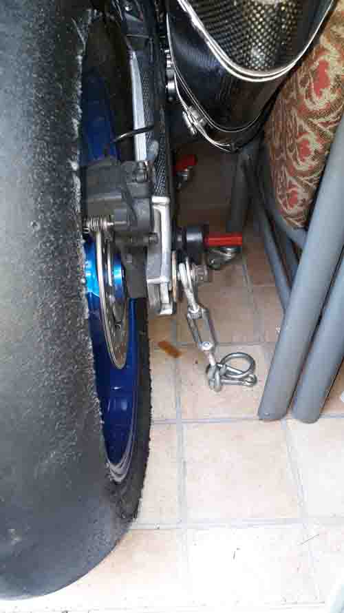 Durch die Hohlachse hinten stecke ich eine Gewindestange. Mit den abgebildeten Seilspannern wird die Kiste dezent nach unten verzurrt. In Fahrtrichtung hält ein Stück Besenstiel an der Innenseite des Gaskastens das ganze in Position.