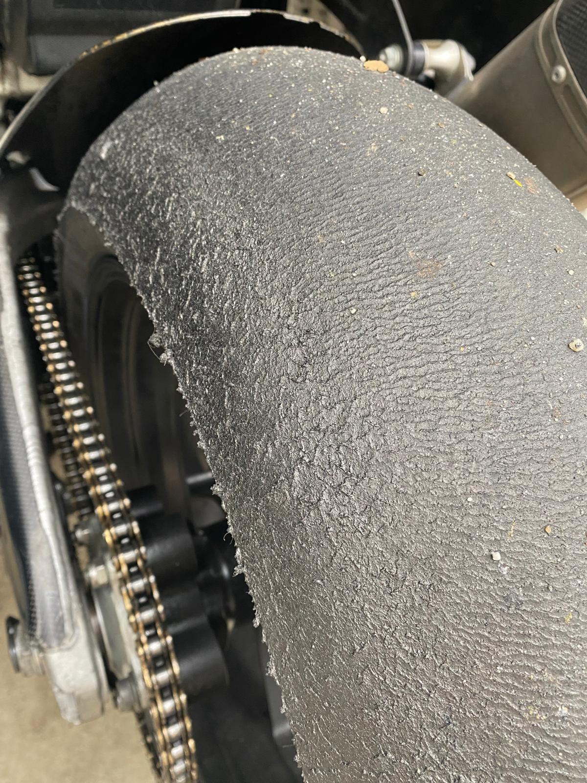 Ich habe den 24'er in Aragón getestet, werde aber aufgrund des Verschleiß Verhaltens auf der HA beim V02 bleiben. Der 24'er hat einen bemerkenswert hohen Anfangs Gripp, der nur unwesentlich nachlässt. Bin den Slick am zweiten Tag gefahren, und direkt meine Bestzeit von 2.06 gefahren. Der Reifen vermittelt ein Quäntchen mehr Feedback im Vergleich zum BS, aber das Verschleiß Bild sieht schon nach dem zweiten Turn so aus: