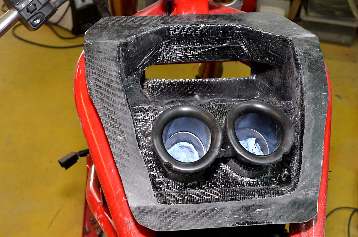 Der "Bastelständer" unter dem Motor ist weg und ein passendes Vorderrad drinnen. Eigentlich sollte das Vorderrad aus einer 2011er ZX10R rein... Reinstecken läßt es sich schon, mit 4.100 g ist es auch leichter als ein 2010er Rad,