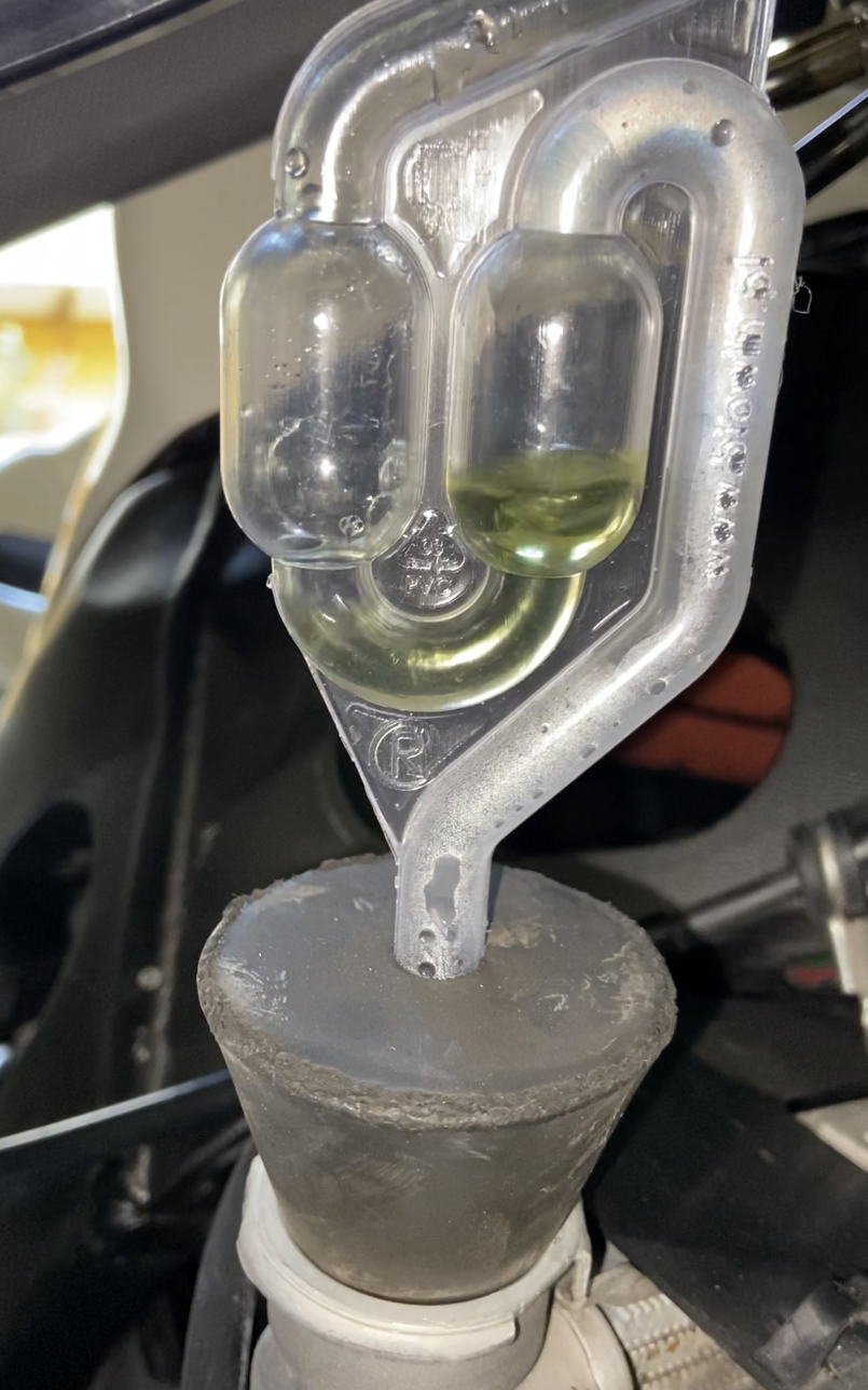 Das könnte erklären, das bei dir beim Fahren dann evtl. dann einfach irgendwann die Luft sich den Weg über den Ausgleichsbehälter sucht und der Flüssigkeitsstand sinkt. Und kann auch höhere Temperaturen erklären...
