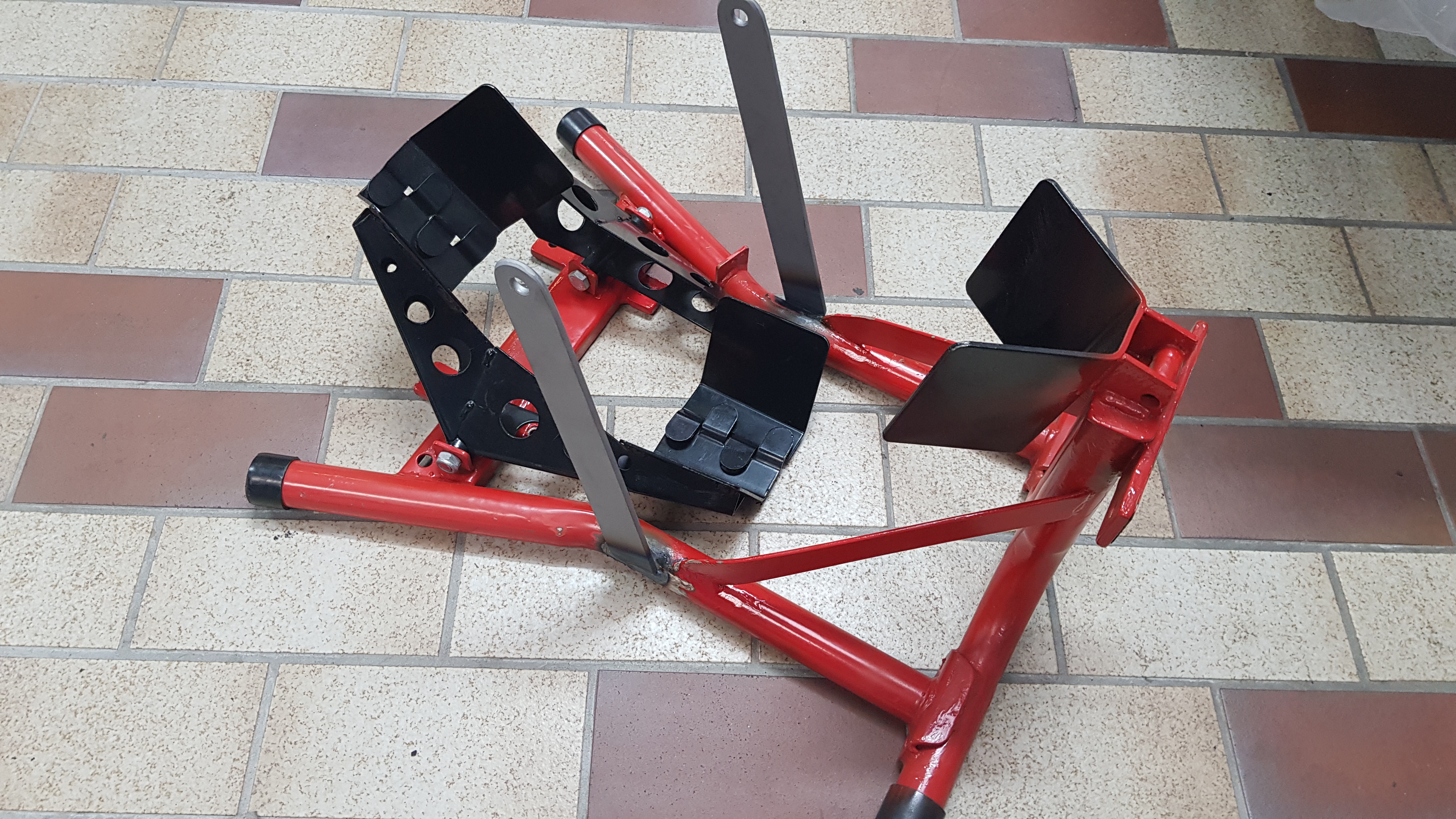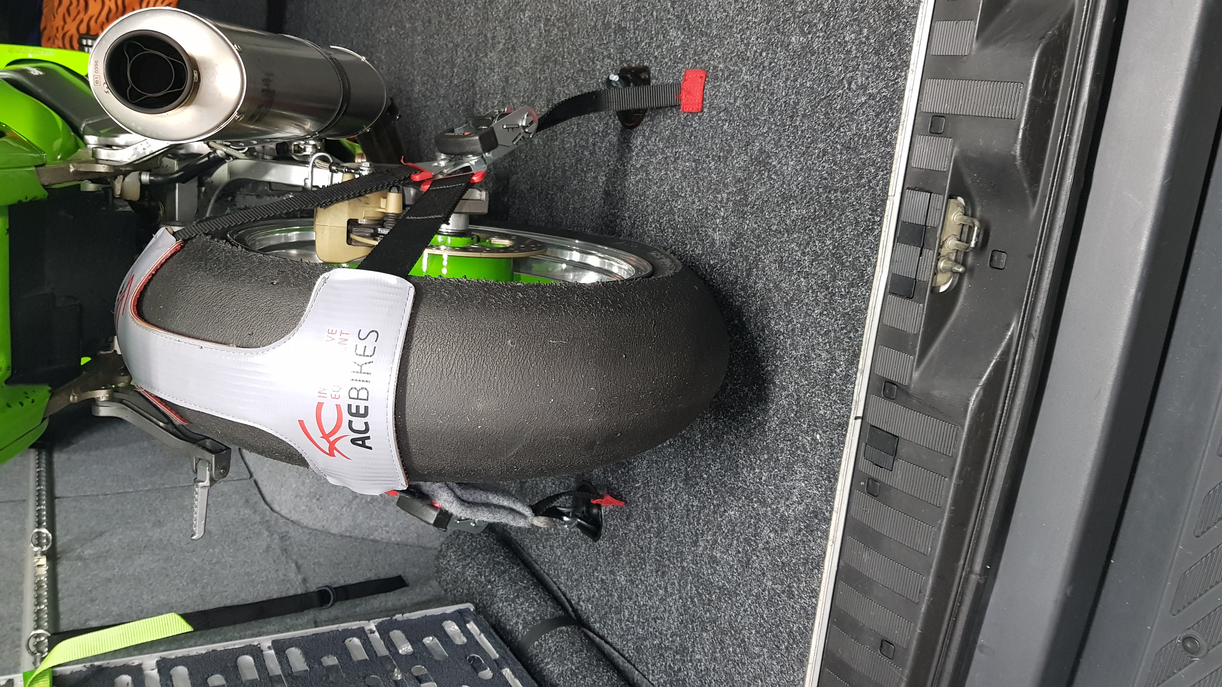 Ich habe an die Wippe 2 Flacheisen angeschweißt. Nachdem das Moped im Ständer steht, wird eine Gewindestange durch die Radachse gesteckt und verschraubt. Dann hinten noch ein Gurt über das Rad und fertig. Das Ganze geht ruck zuck und ist Bombenfest