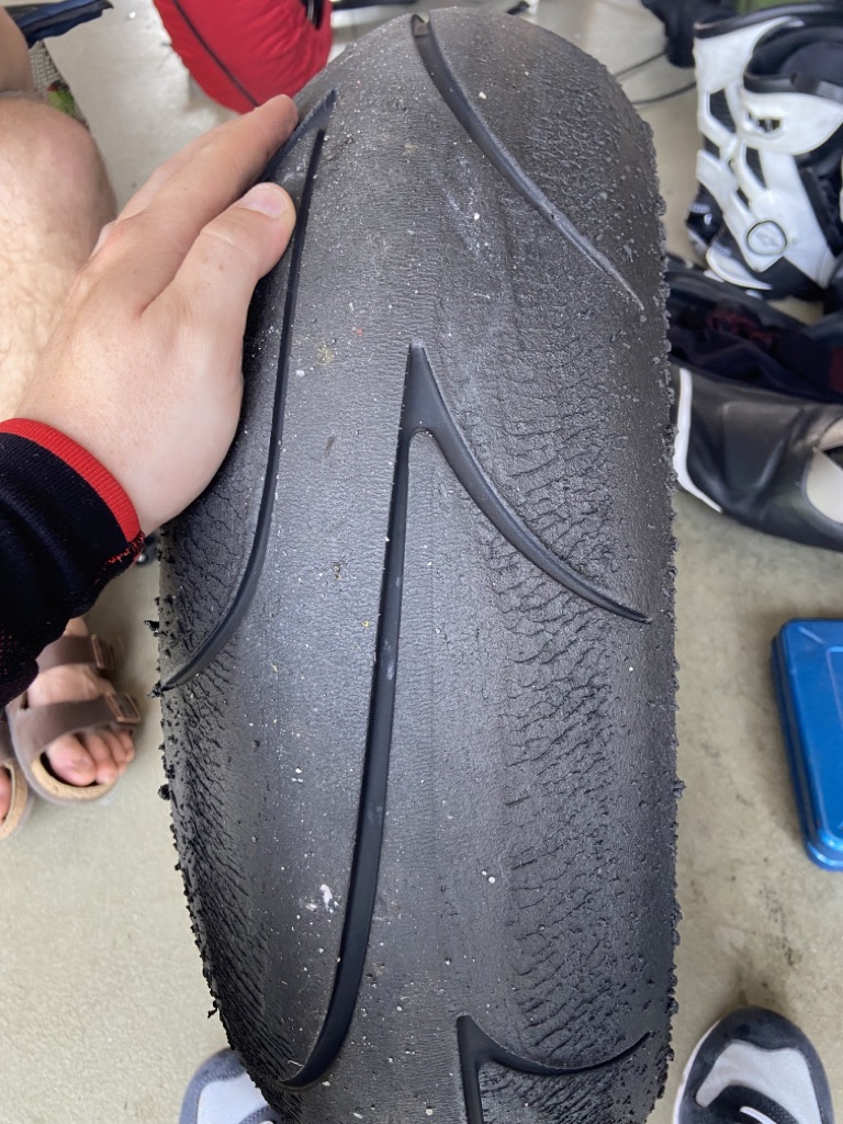 Die erste negativ Erfahrung habe ich 2 Wochen zuvor in Most machen müssen. Ich habe mir zusätzlich zwei Hinterreifen in MS0 gekauft, da die derzeit im Angebot sind. Am ersten Tag waren 55-60 Grad Asphalttemperatur. Im letzten Turn habe ich den MS0 gefahren -alles ok. Am nächsten Morgen im ersten Turn waren ca. 25-max. 30 Grad und er ist sofort aufgerissen und war hinüber. Zu fahren war leider nicht mehr - Reifen war kaputt. Es hat an dem Morgen aber auch ein paar Pirellis SC 0 das leben gekostet auch wenn die nicht ganz so heftig aufgerissen waren wie meiner.