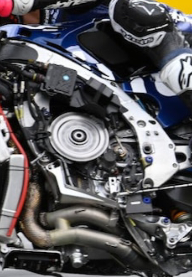 Aufgrund der weggeflogenen Verkleidung an Bastianinis GP20 konnte man einen interessanten Blick darunter werfen, die rotierende Scheibe ist zugleich Lichtmaschine und Schwungscheibe, die es in verschiedenen Durchmessern und Gewichten gibt um die Motorcharakteristik auf diese Weise beeinflussen zu können!