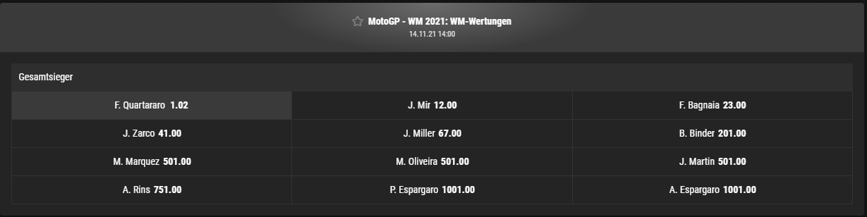 Ich finde FQ wird im Moment ein wenig überschätzt, denn die Konkurrenz patzt teilweise selbstverschuldet oder wegen den Reifen. Siehe Bagnaia, der hat ja nicht während des Rennens das fahren verlernt, dem ging einfach der Reifen ein. Ein Miller dagegen auf dem gleichen Möppi mit den gleichen Reifen wird 4.