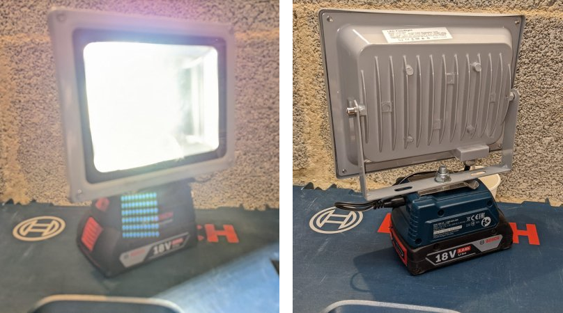 Sollte dann so aussehen. nur mit 2*20W an 12V Falls schon Bosch 18V vorhanden ist, der Bosch 18V USB Adapter hat auch einen 12V Ausgang. Hab mir da einen der billigen 12V LED Strahler draufgepackt und so für ~30€ Euro ne mobile Arbeitsleuchte. Die fast 300€ die Bosch dafür haben will ist mir n bisschen zu viel