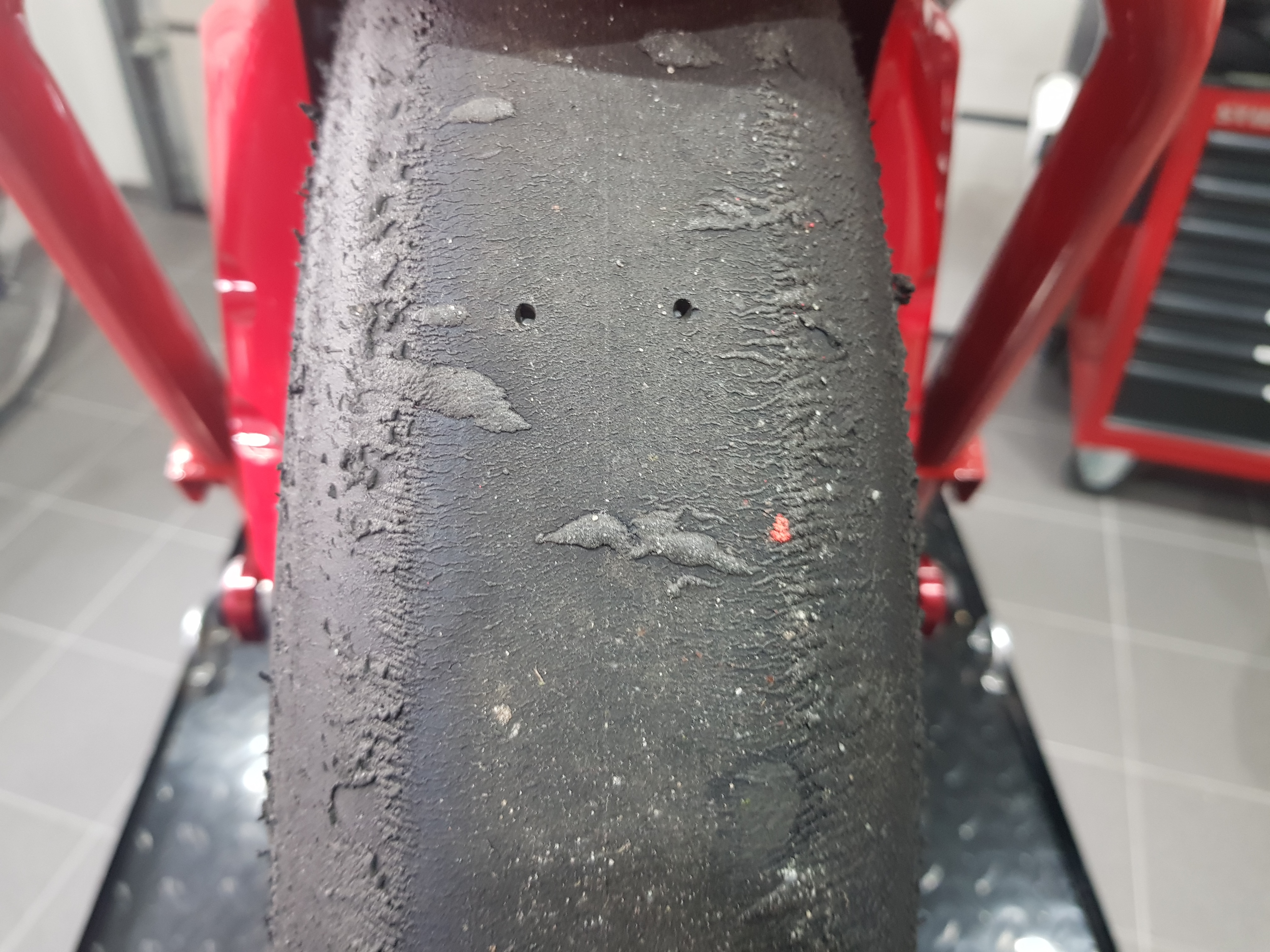 Ich hoffe mir kann hier jemand helfen. Ich bin letztes Jahr zum erstenmal mit slicks gefahren, waren die Dunlops kr 106/108. Der Vorderreifen (ms4) sieht für mich so aus als ob ich den überhaupt nicht auf Temperatur halten konnte.