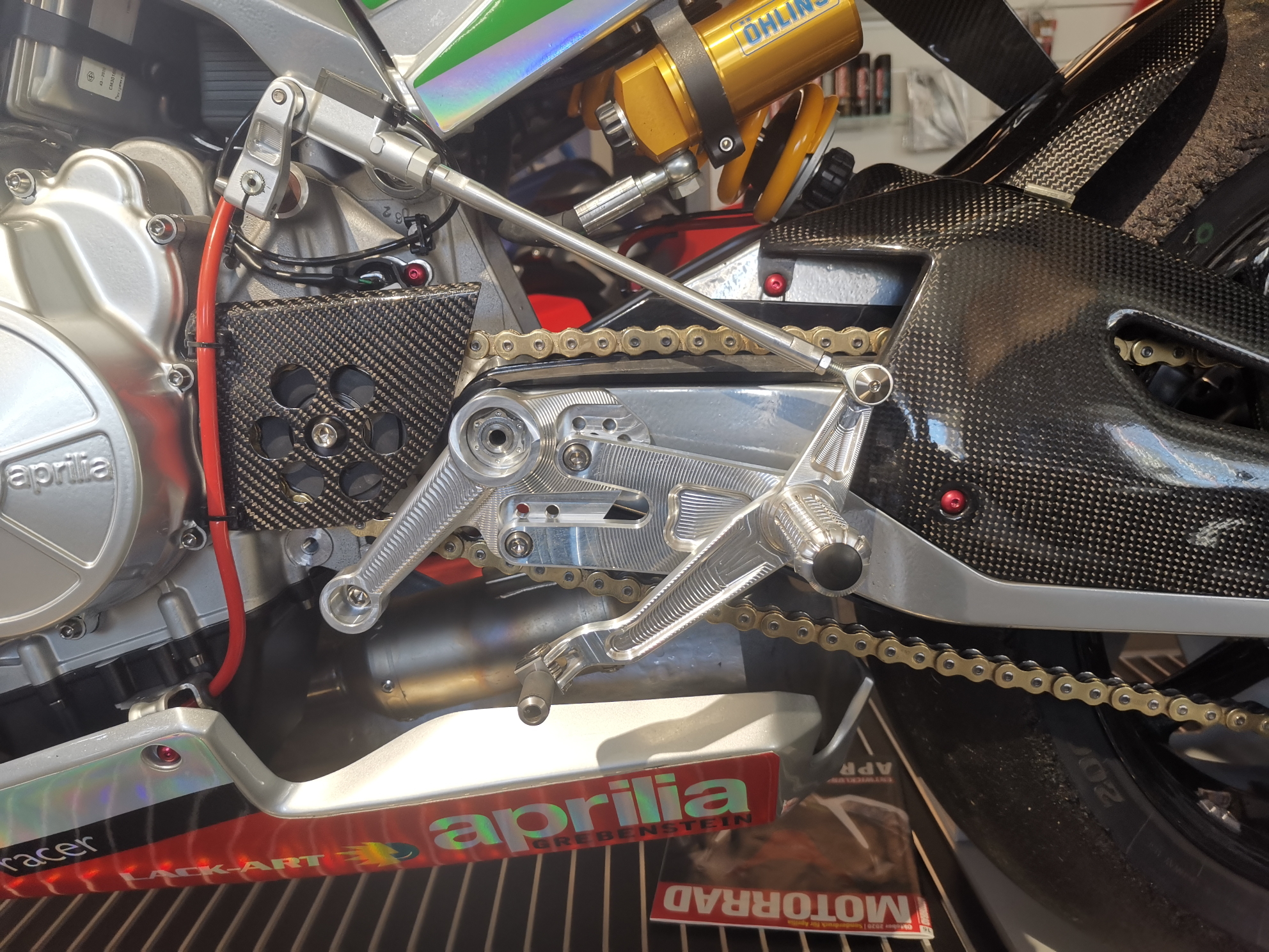 Alles vom Feinsten (Thyssen-Krupp, Öhlins, Brembo, Akrapovic, ... etc.) und sauber gemacht