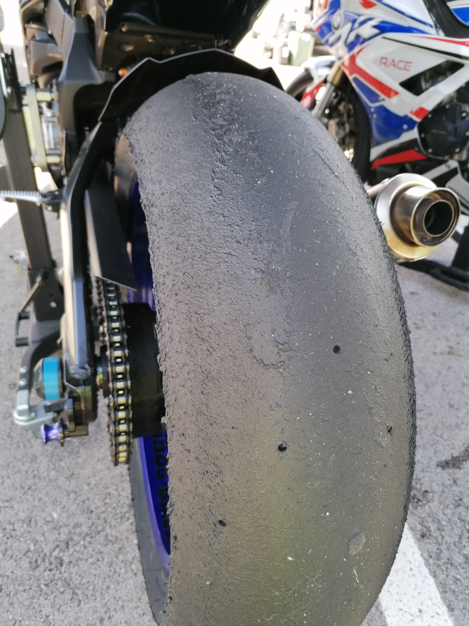 Für mich Durchschnittsfahrerin funktioniert der Reifen wunderbar bei einer Aussentemperatur von 30 Grad. Ich habe leider Mittags (2. Tag, es wurde immer wärmer) vergessen, auf 1.55 bar runterzugehen. Daher ist der Reifen rechts wieder aufgerissen. Zurück in der Box nach 20 Min. Fahrzeit hatte ich direkt gemessen und satte 1.70 (selbst schuld). Der Reifen funktioniert super zwischen 1.50 - 1.60........ für mich. Reifen gibt deutlich Feedback, wenn er fertig ist und rutscht. In der Parabolika hat er sich erstmals gemeldet. Da hatte er 10 Turns hinter sich. Auf dem Foto hat er noch eine Menge Dreck gesammelt gehabt, da ich nach Streckenausfahrt durch das ganze Fahrerlager rodeln musste zum Stellplatz. Fast vergessen: Vorne Soft ist der Kracher. Kann keine Unterschiede zu BT V02 Front ausmachen