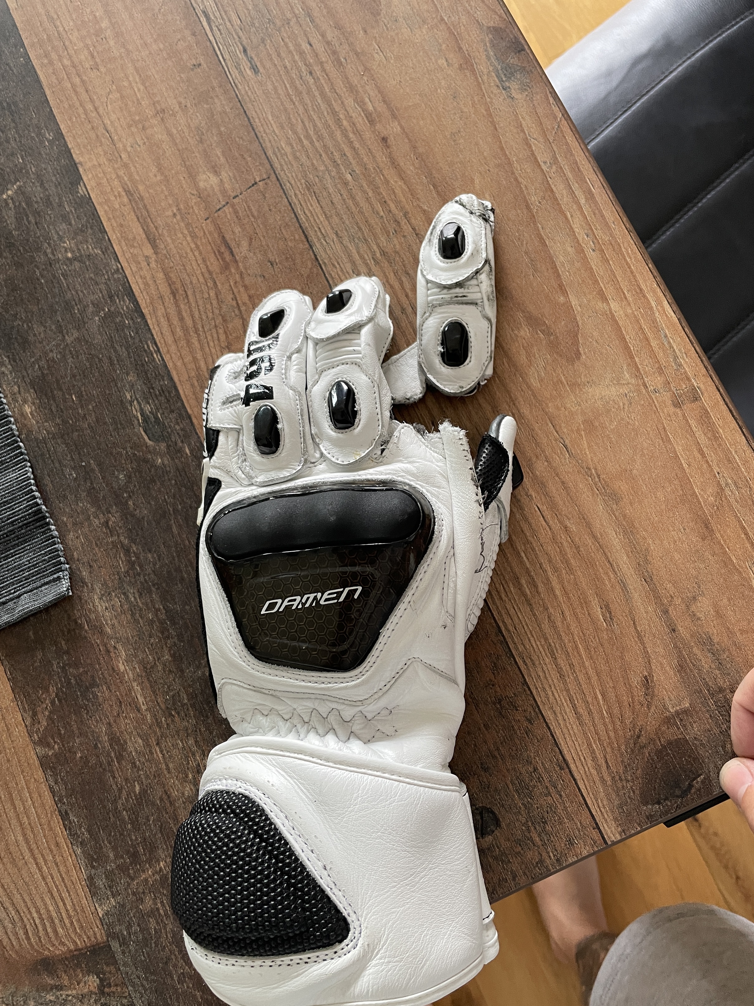 In den Videoaufzeichnungen meines Buddys, der hinter mir war, sieht man, dass ich wohl beim Abflug mit der Hand zwischen Fender und Rad gekommen bin. Der Handschuh ist mir dann von der Hand gerissen worden und weggeflogen.