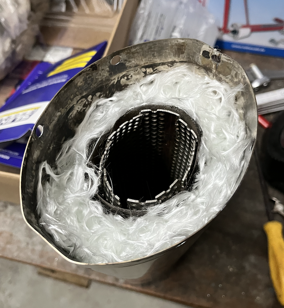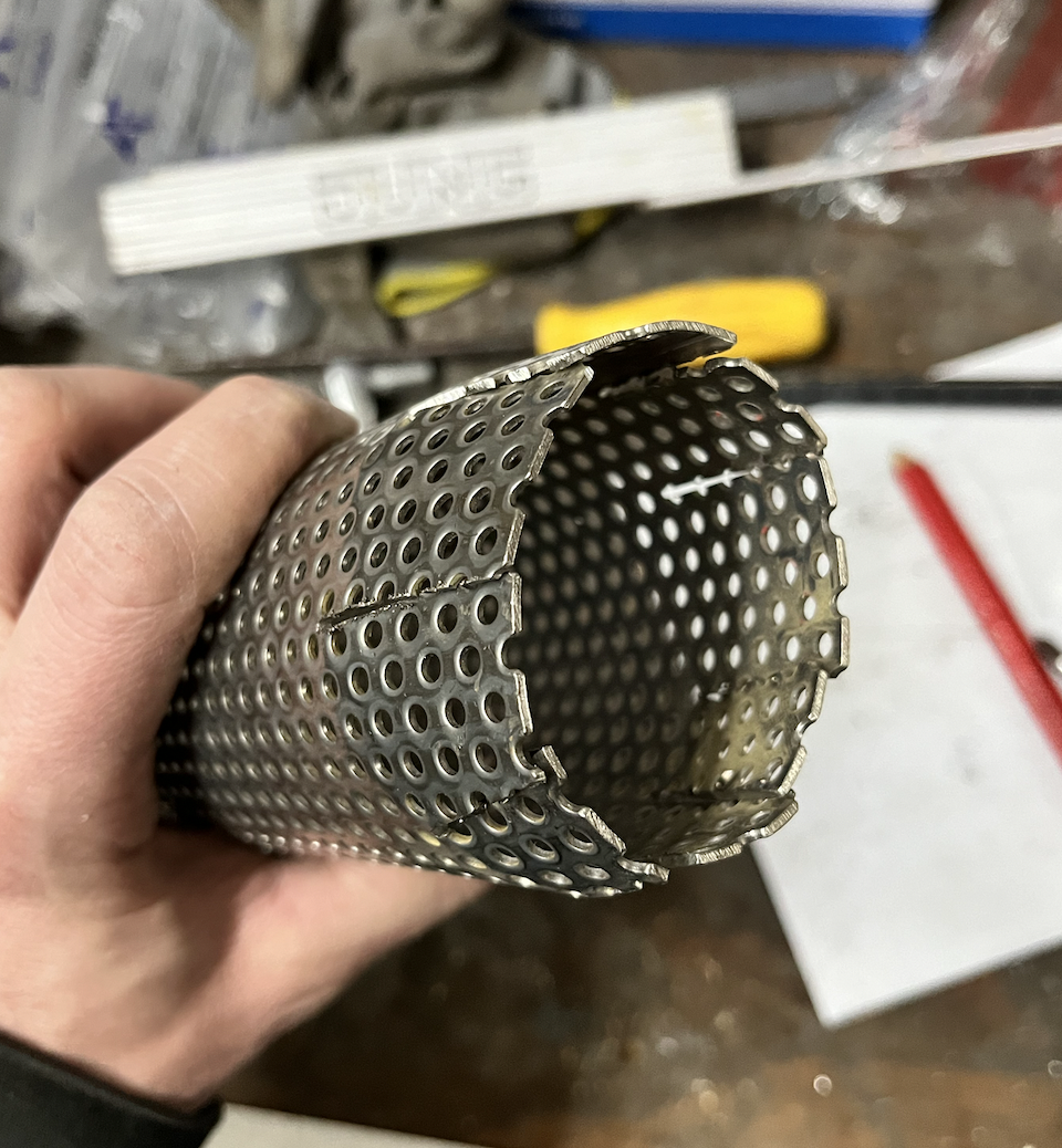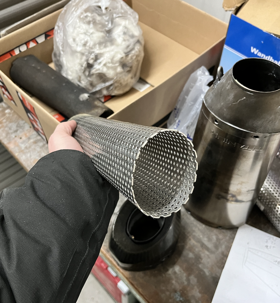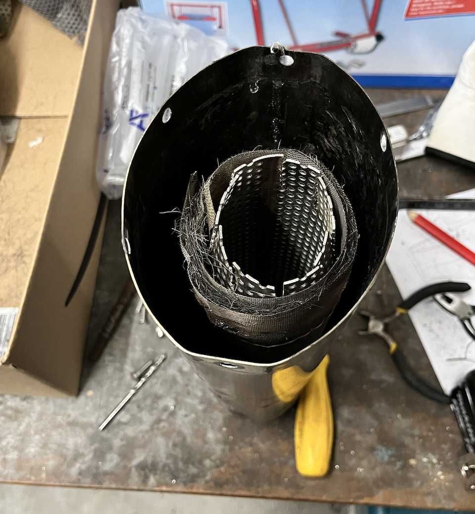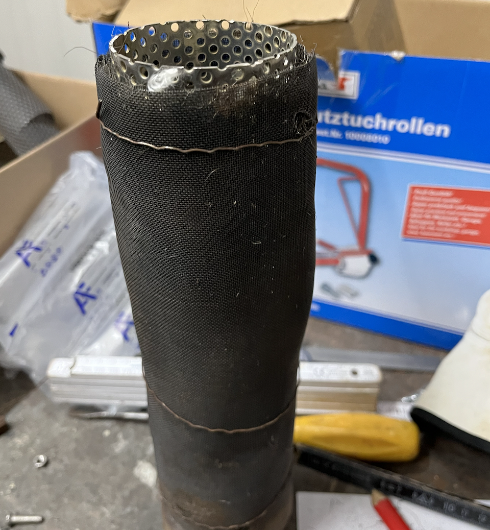 Siebrohr habe ich auf die richtige Länge gekürzt, oval gebogen und eingeschnitten, damit ich es später in die Endkappe einführen und somit auch fixieren kann. War alles ein wenig gefummel, macht aber nun einen ganz soliden Eindruck. 250g Wolle rein, vernietet und gut.