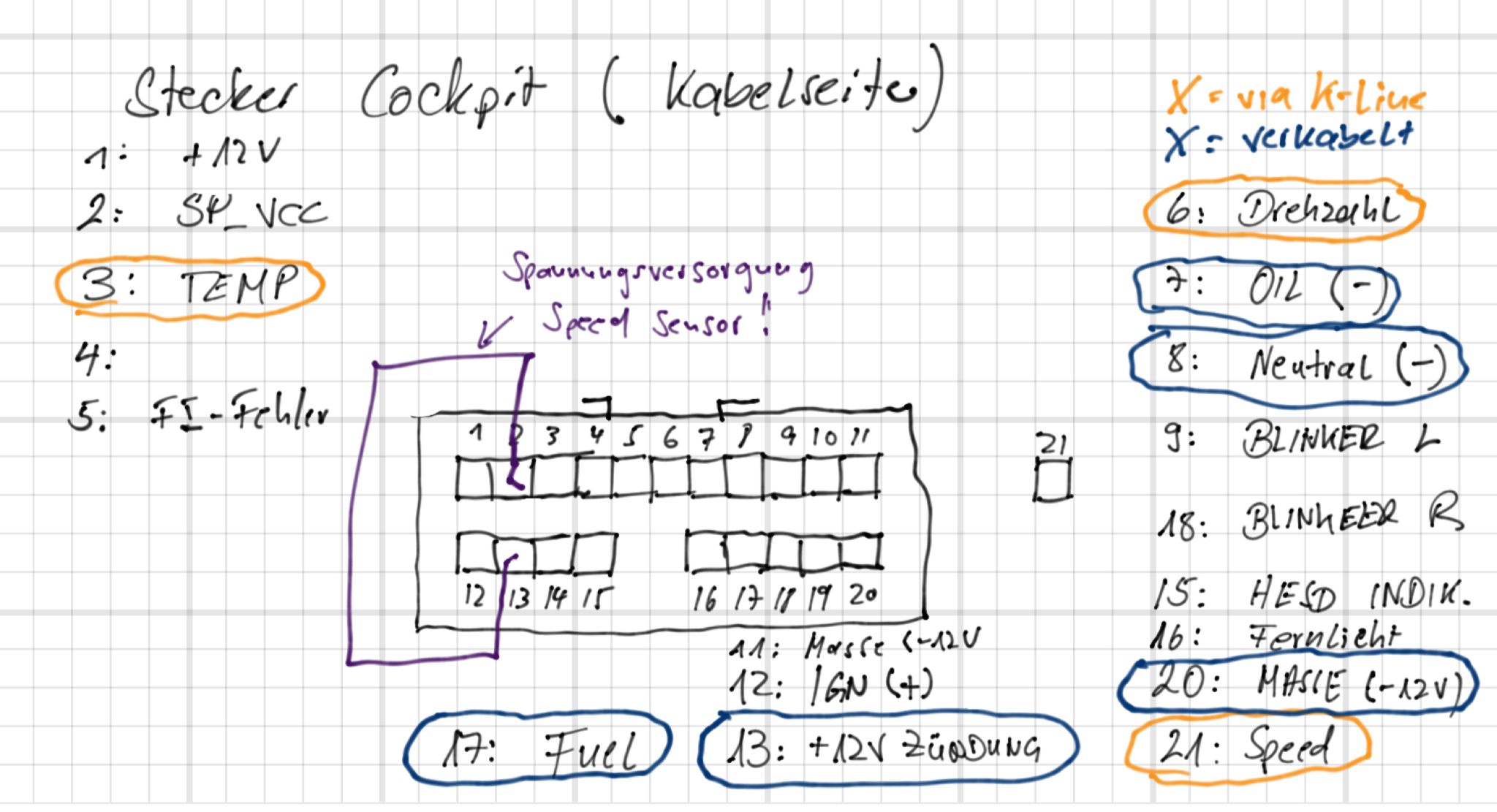 Hier mal der Schaltplan aus dem Werkstatthandbuch, Vorsicht, da gibts verschiedene Stände. In dem Bild ist was ich rausgemessen habe beim Umbau auf mei AIM-Dashboard. Die Brücke zur Spannungsversorgung des Geschwindigkeitssensors hat mich fast zur Verzweiflung gebracht.DonCojon hat geschrieben:
